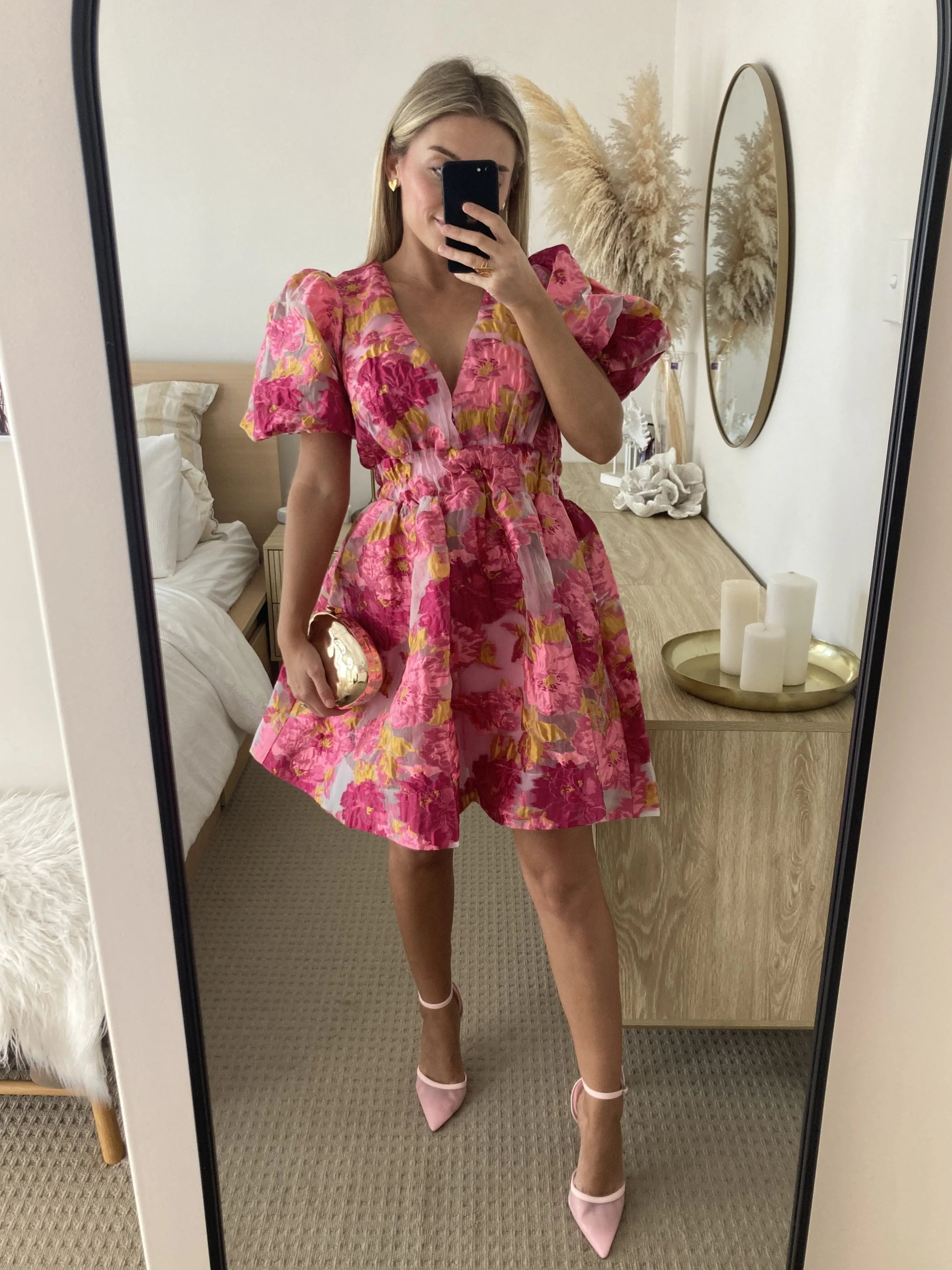 This sophisticated mini dress features a semi-sheer jacquard fabric with a V neckline and short balloon sleeves. It includes an invisible back zipper, a thick elasticated waistband, and a structured skirt hem. The dress is fully lined for a polished look.