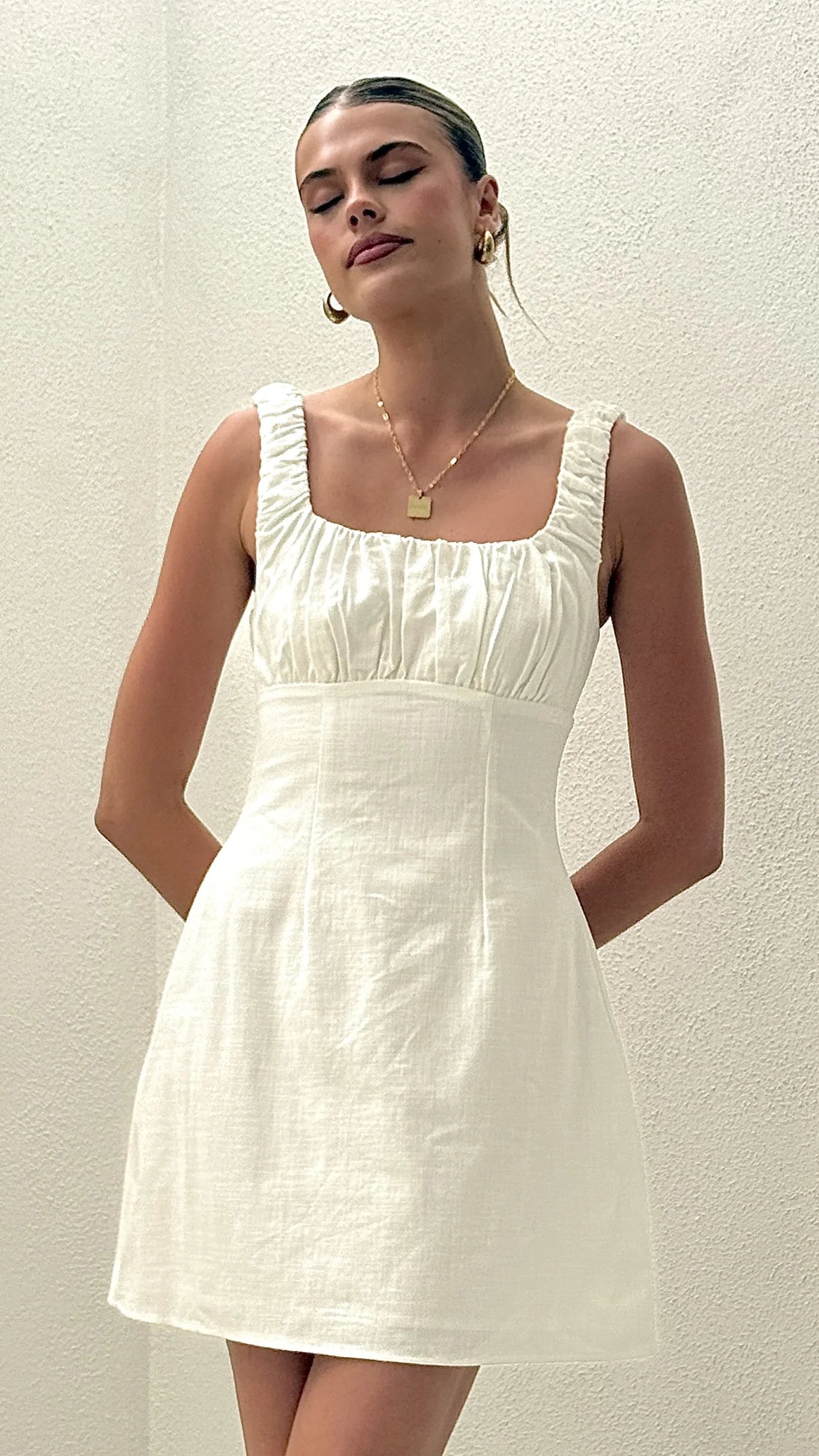 The Adley Mini Dress in white brings fun to sophistication with its mini length and wide fixed straps that keep things comfy. The gathered bust adds a charming touch, while the square neckline frames your style perfectly. Fully lined with an invisible center back seam, this A-line beauty promises a smooth fit and a flirty silhouette for playful days and nights.