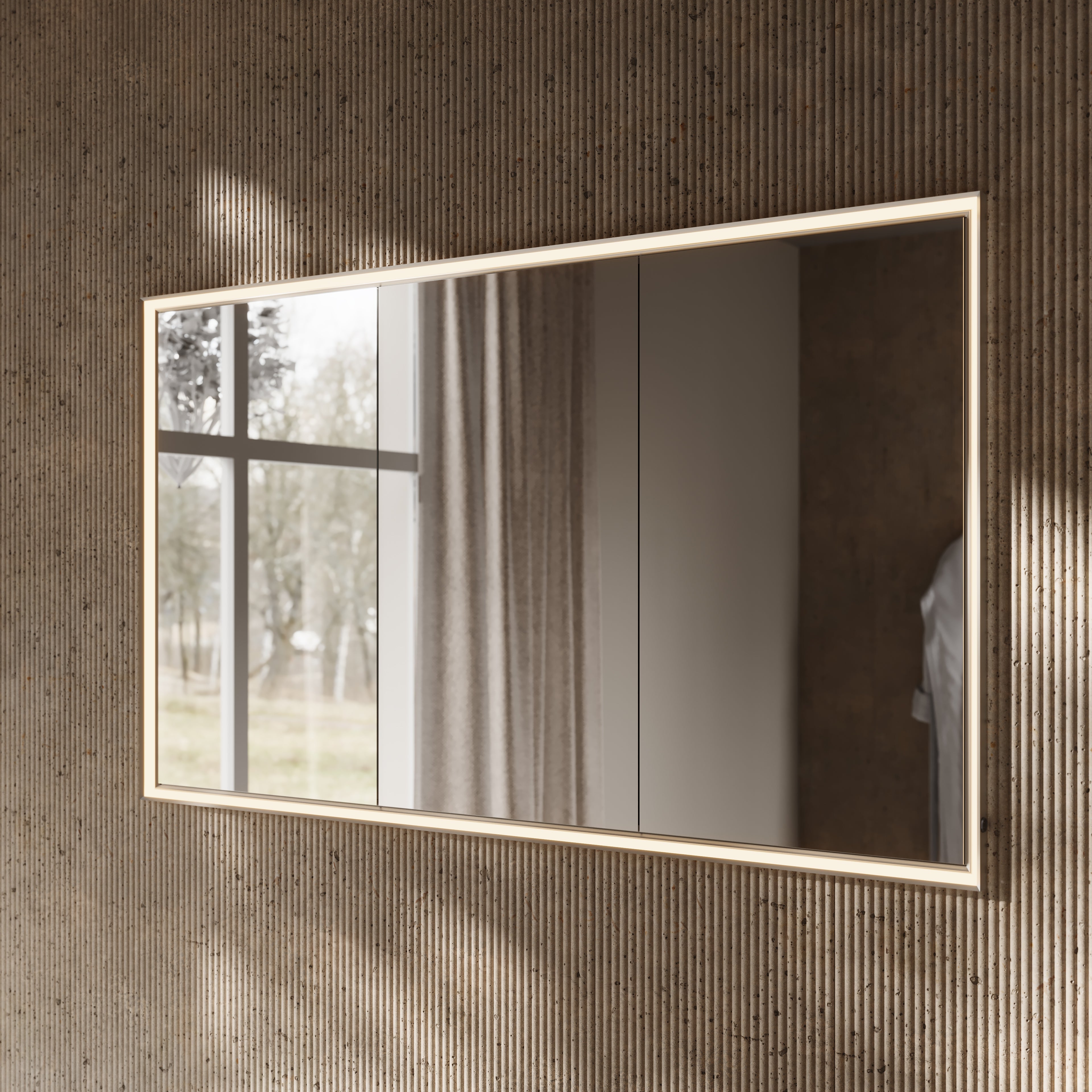 The cabinet, at 1200mm wide, offers a generous concealed storage space to ensure a neat and uncluttered living space, perfect for storing bathroom essentials. The cabinet is designed with 360 degree ambient lighting, illuminated by a motion-activated sensor to the side.