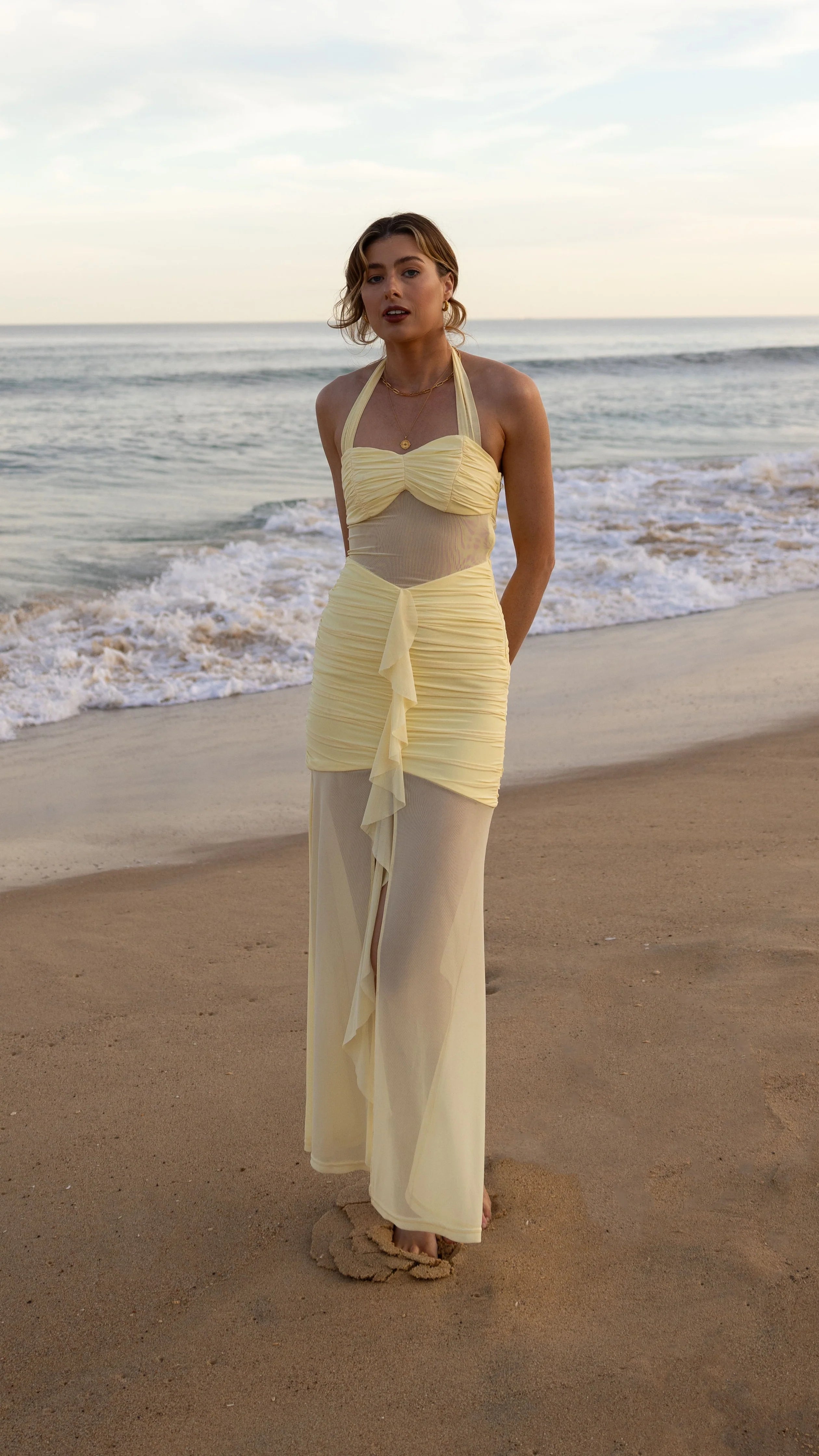 The Alani Maxi Dress in yellow offers a floor-length silhouette with a halter neck tie closure. It features a silicone gripping in the bust for added support, and a sheer waist. An invisible side zipper ensures a seamless look, while the sheer skirt with a front slit and delicate frill embellishments at the front add a touch of sophistication.