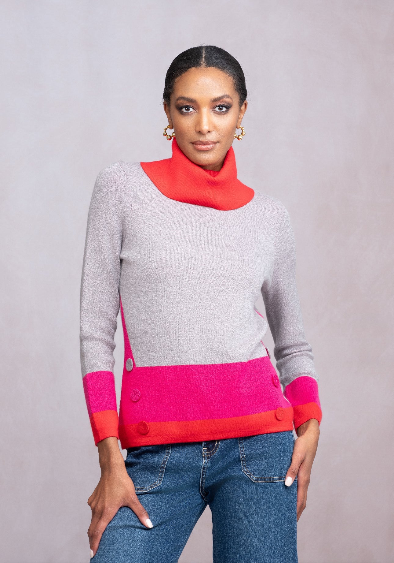 Alison Sheri fitted sweater featuring a bold colour block design in a soft knit fabric that The roll neck adds warmth, whilst the Multi colour faux button detail each side and beautiful vibrant stripe detail along the bottom of hemline, sleeves and stripe detail up the side gives a touch of style and design. A must-have style for those casual days and cozy evenings in effortless style