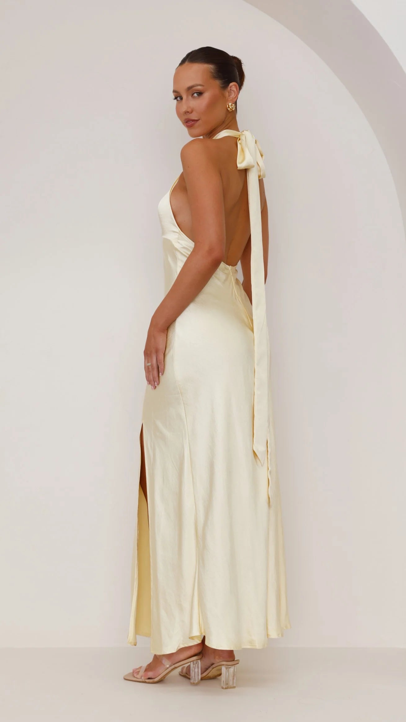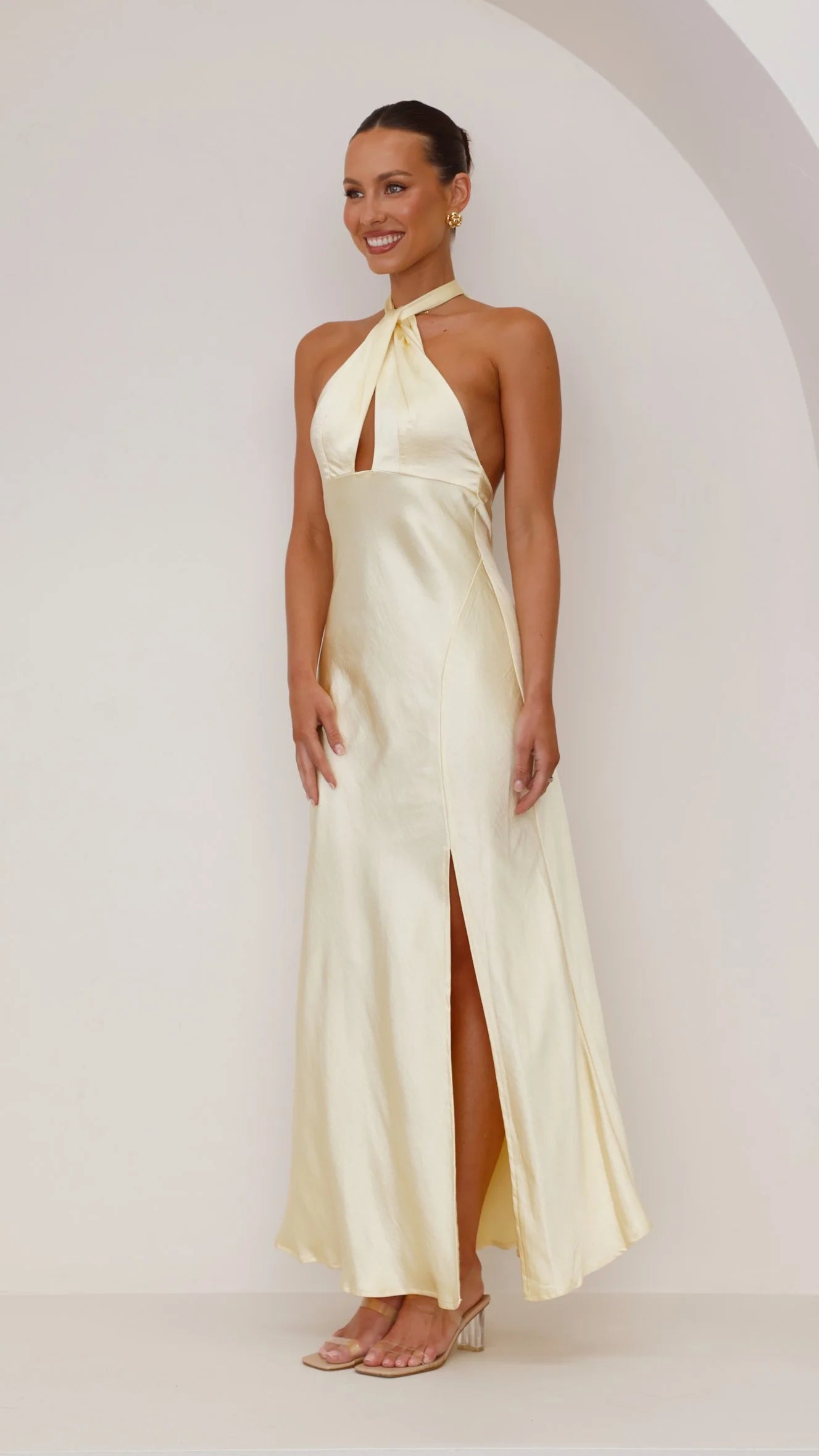 The Amalia Maxi Dress will be a stunning new addition to your wardrobe featuring a halter neck cut out detailing, adjustable neck tie, side slit and an enclosed zipper at the back.