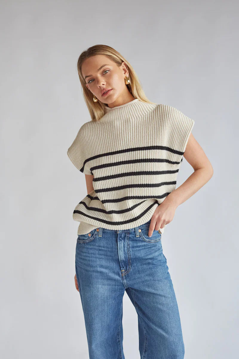 Achieve a classy and refined look in the Amari Mock Neck Sleeveless Sweater Top! This chic knit top is made of a ribbed knit material and features a horizontal striped design, mock neckline, and a sleeveless bodice. Pair with some to complete the look!