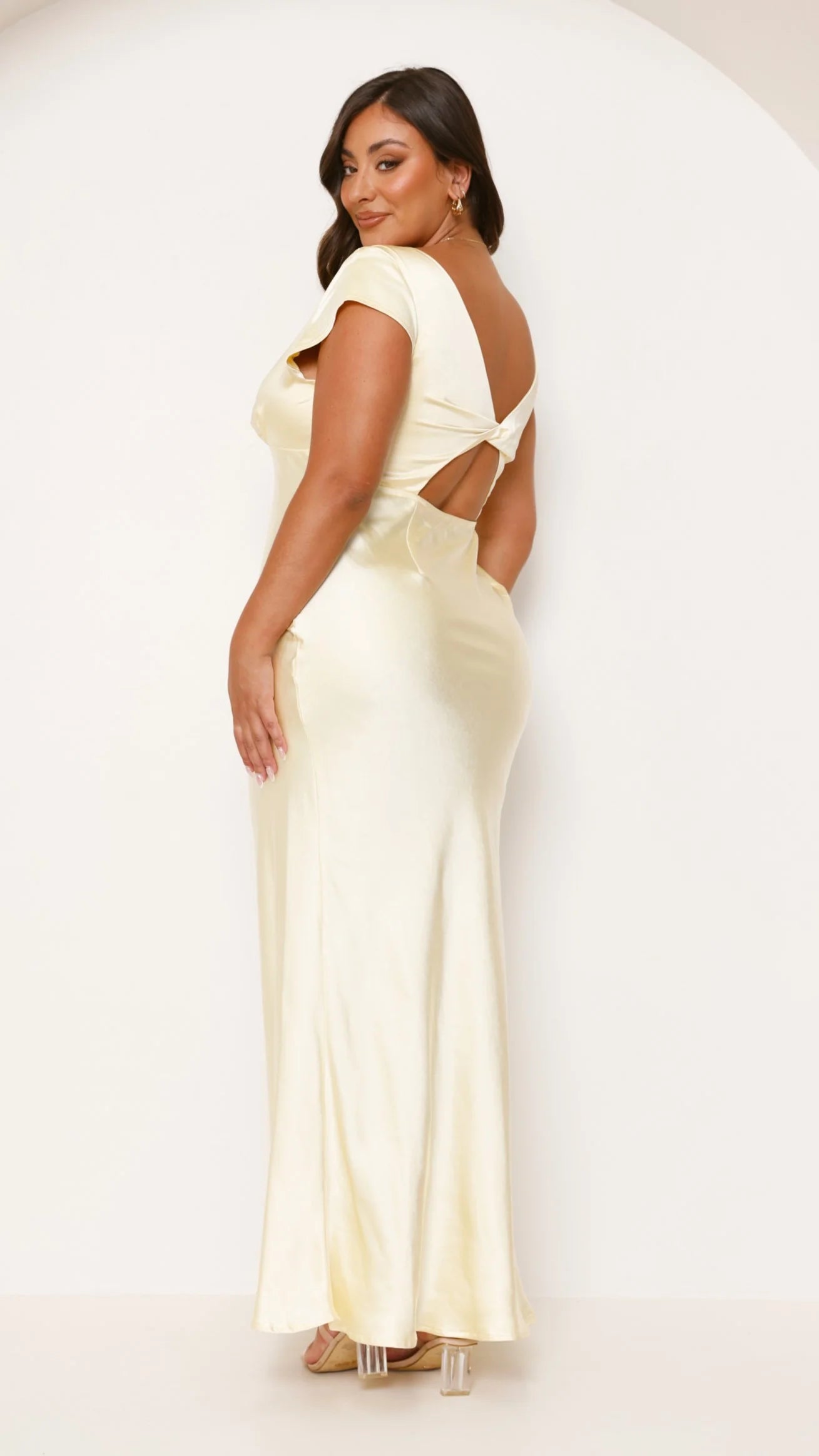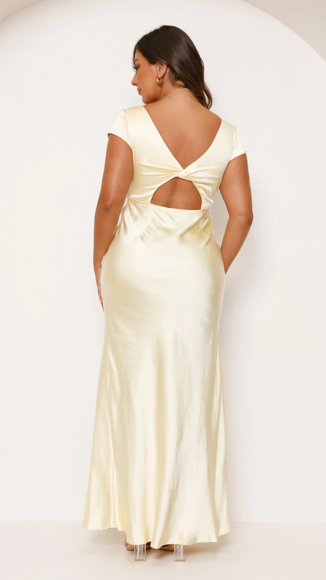 Discover timeless elegance in our Amelia Maxi Dress in Yellow. The V neck line and gathered bust detail add a touch of sophistication to this luxurious, full-length dress. With an open back and twist detail, this elegant style is perfect for any formal occasion.
