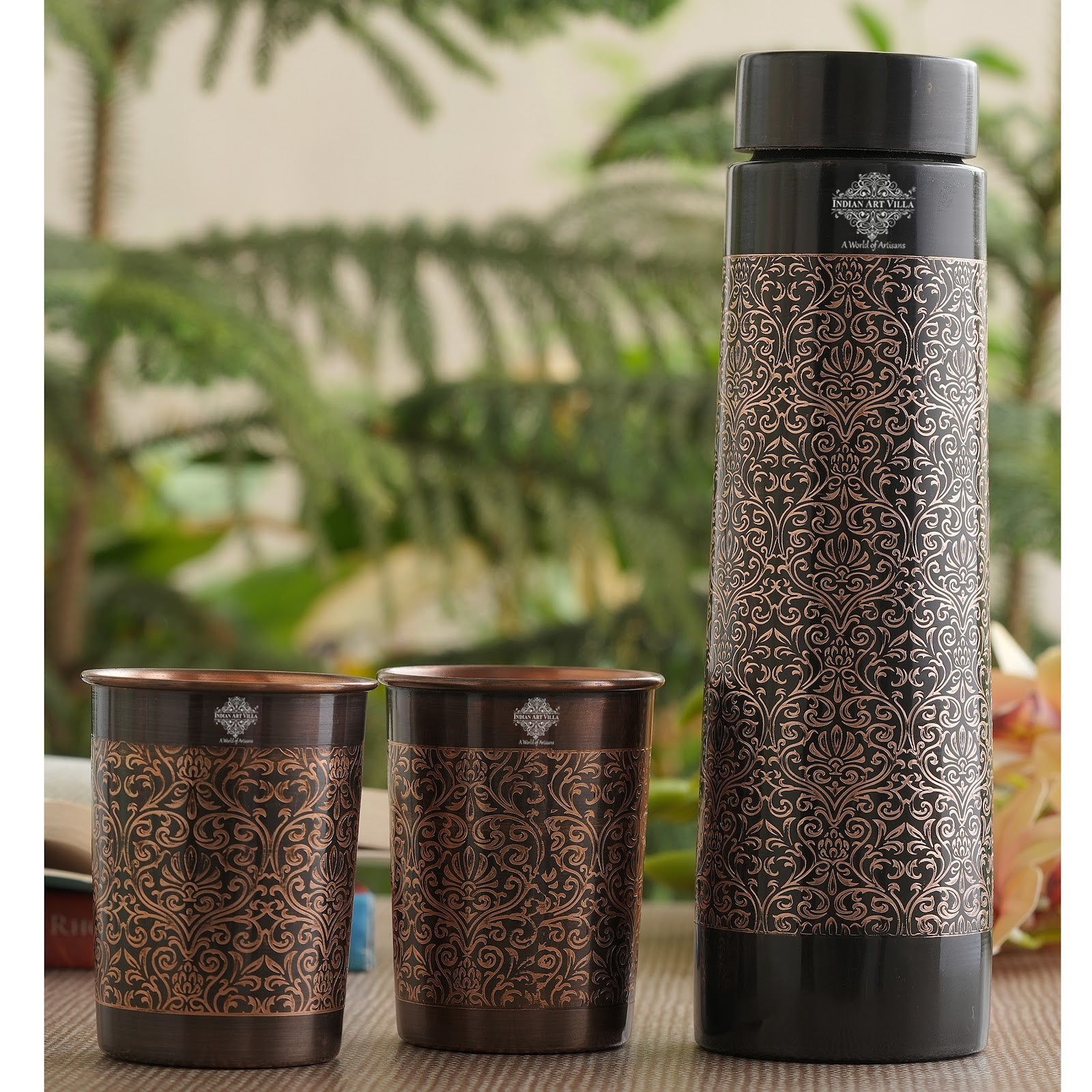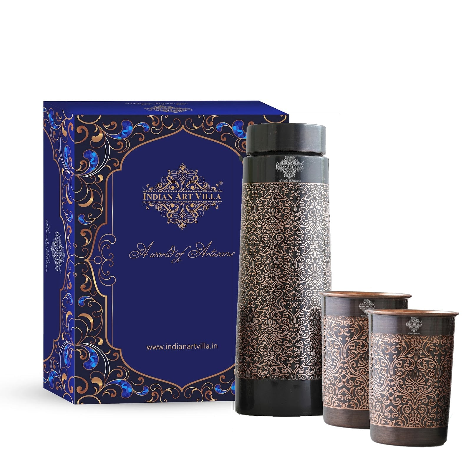 Indian Art Villa Antique Finished Embossed Design Drinkware Gift Set is a remarkable combination of traditional craftsmanship and contemporary design, featuring a unique pyramid-shaped copper bottle and a matching copper glass. This exquisite set is meticulously handcrafted by skilled artisans, with each piece displaying intricate embossed designs that are inspired by India's rich cultural heritage. The bottle and glass are both crafted from 100% pure copper, known for its numerous health benefits. Drinking water from copper vessels is believed to improve digestion, boost immunity, and balance the body's pH levels, making this set not just visually appealing but also beneficial for your health. The antique finish on the copper surfaces enhances the set’s aesthetic appeal, giving it a vintage charm that can elevate the ambiance of any space. The intricate embossing on the bottle and glass reflects the fine artistry of Indian craftsmen, making each piece in this set a work of art. Easy to clean and maintain, this drinkware set is durable and eco-friendly, offering a sustainable alternative to plastic bottles. The Indian Art Villa Antique Finished Embossed Design Drinkware Gift Set is a timeless piece that brings together beauty, health benefits, and cultural significance.