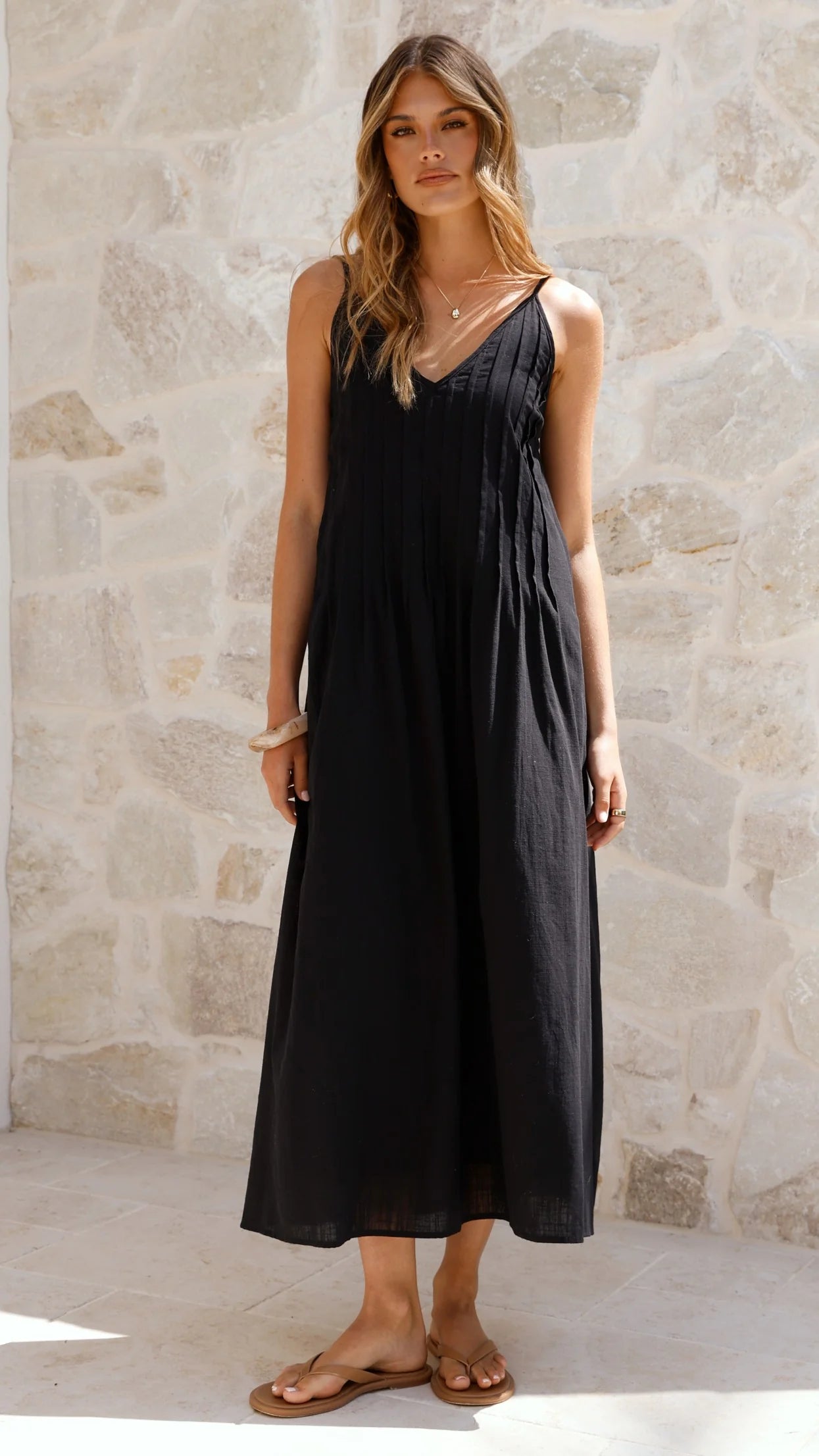 This maxi dress features a flattering V-neckline and delicate adjustable straps. Fully lined for comfort, it showcases a pleated bust and an elasticated back for a tailored fit. Completed with an invisible side zipper, it is crafted from 100% cotton for breathable elegance.