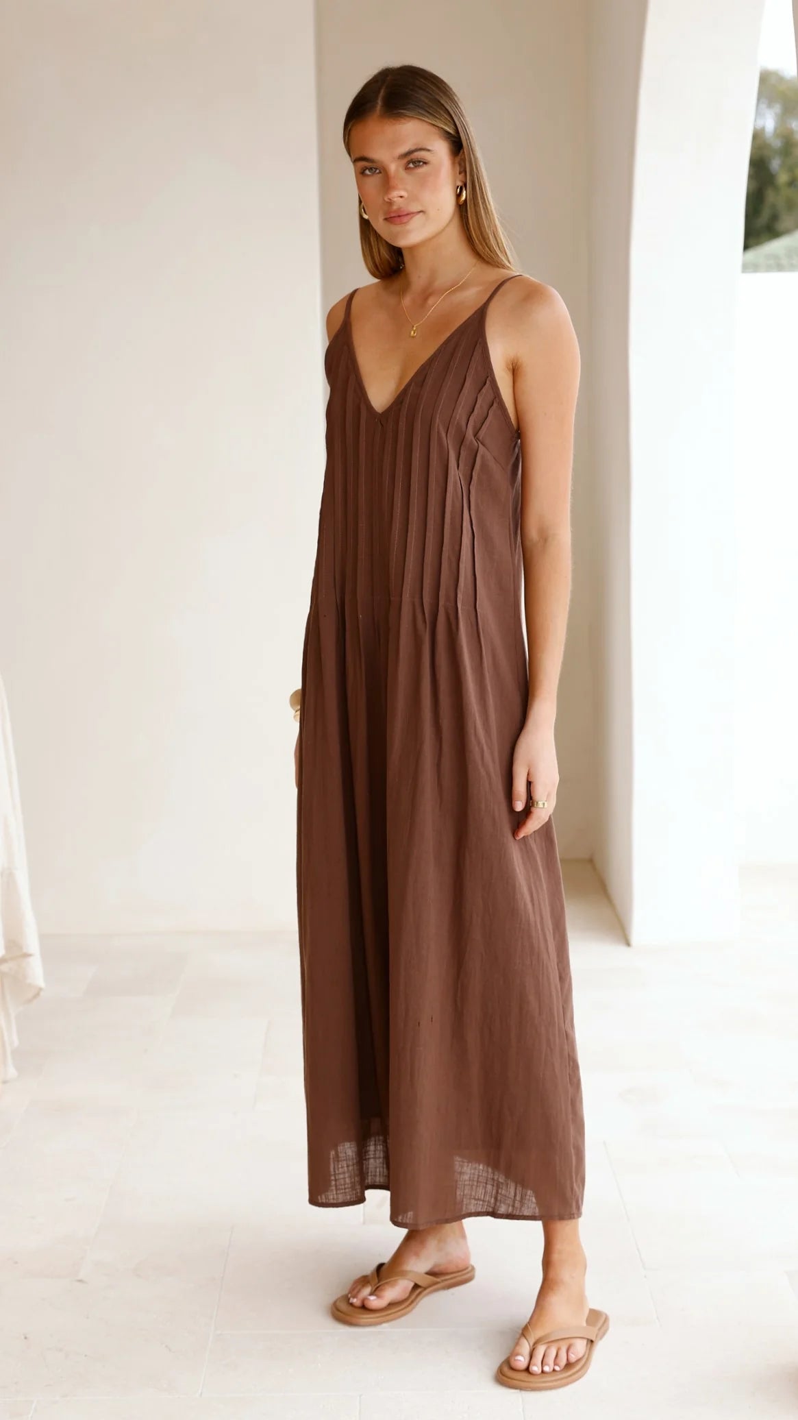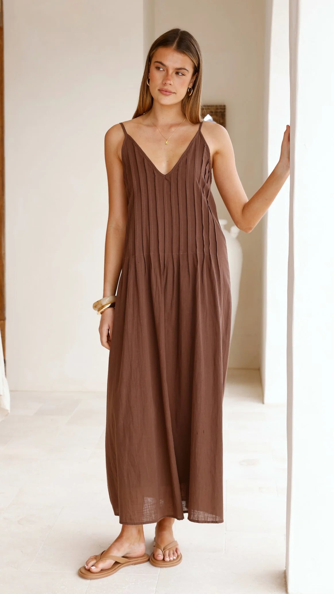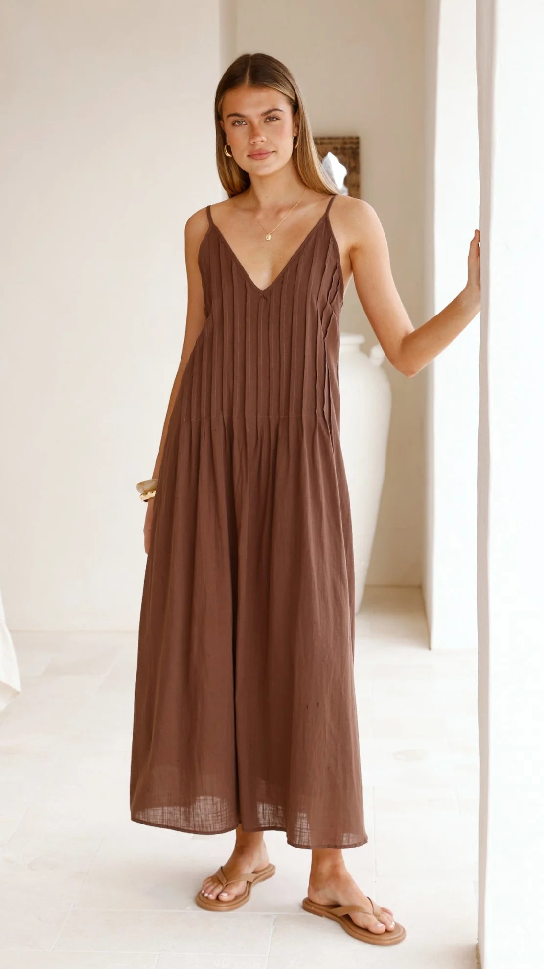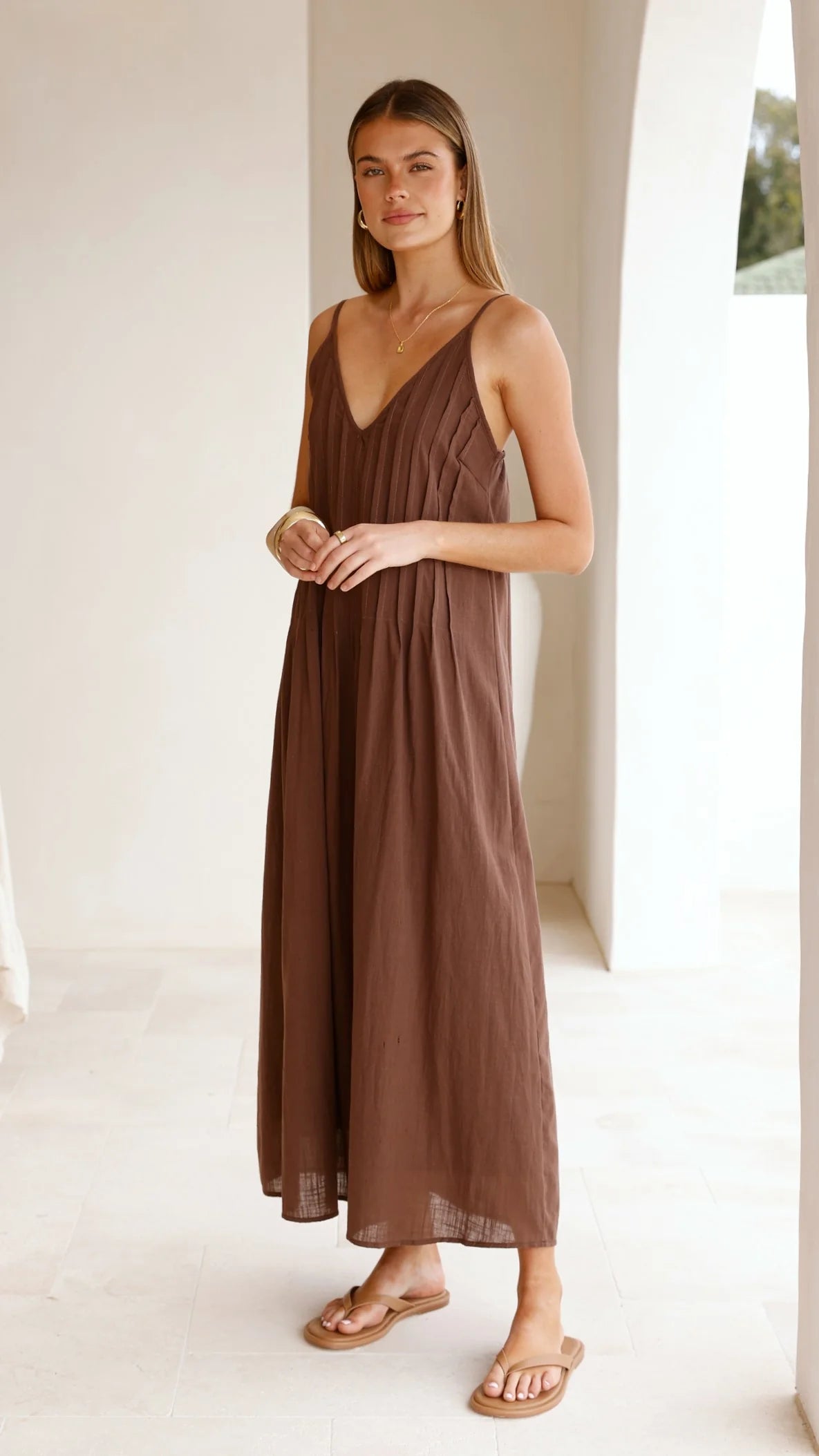 This chocolate maxi dress features a flattering V-neckline and delicate adjustable straps. Fully lined for comfort, it showcases a pleated bust and an elasticated back for a tailored fit. Completed with an invisible side zipper, it is crafted from 100% cotton for breathable elegance.
