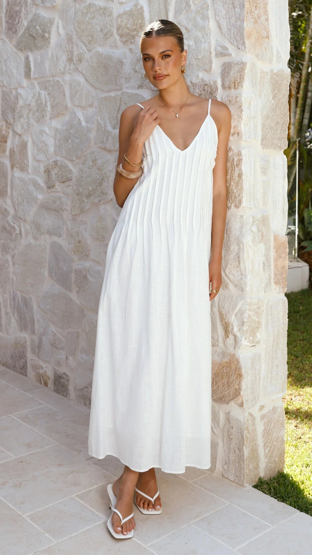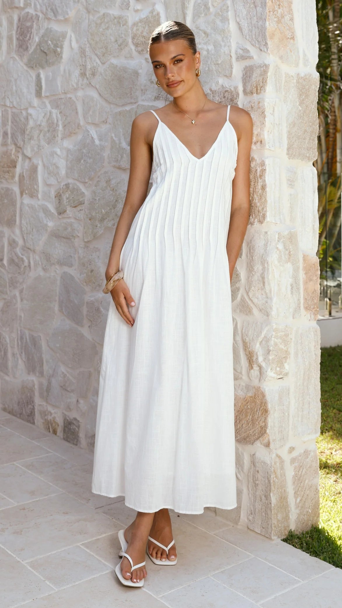 This maxi dress features a flattering V-neckline and delicate adjustable straps. Fully lined for comfort, it showcases a pleated bust and an elasticated back for a tailored fit. Completed with an invisible side zipper, it is crafted from 100% cotton for breathable elegance.
