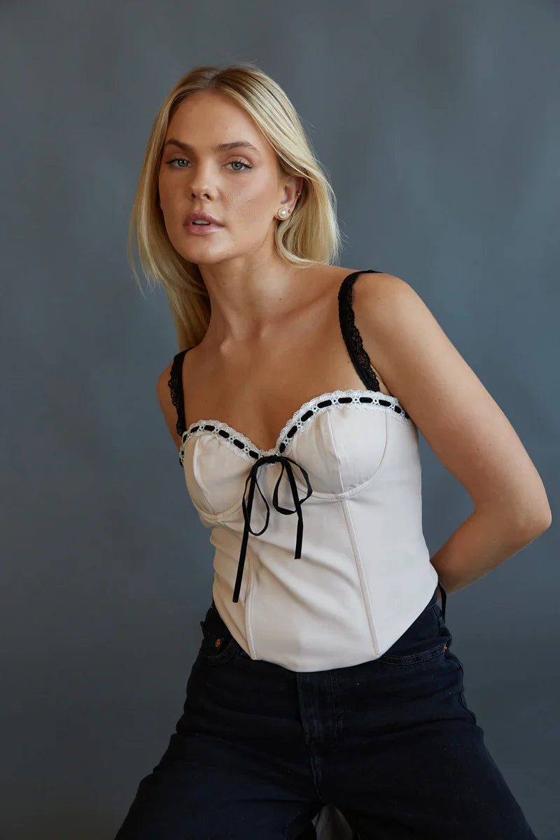 The Ayla Contrast Corset Top is the perfect combination of sultry and sweet! This feminine top features a bustier-style bodice, supportive boning details, black lace spaghetti straps, and a white lace trim with an interweaved black velvet ribbon that ties at the center. Pair with to complete the look!
