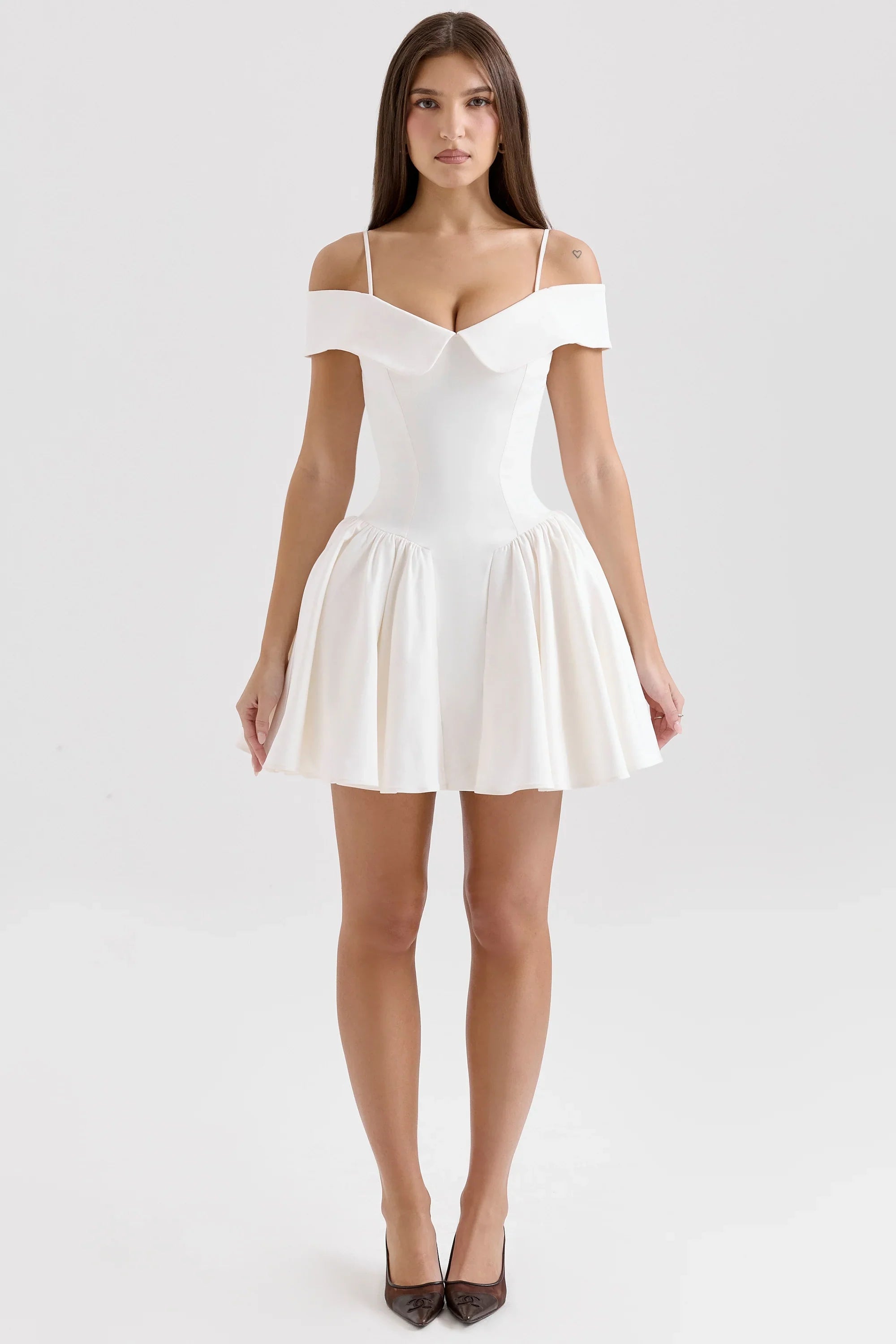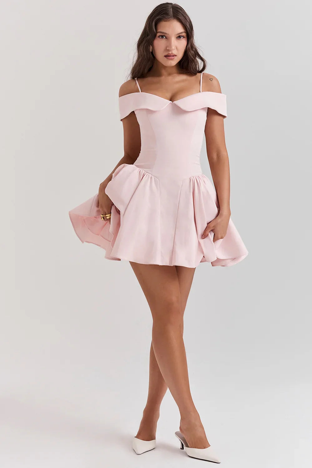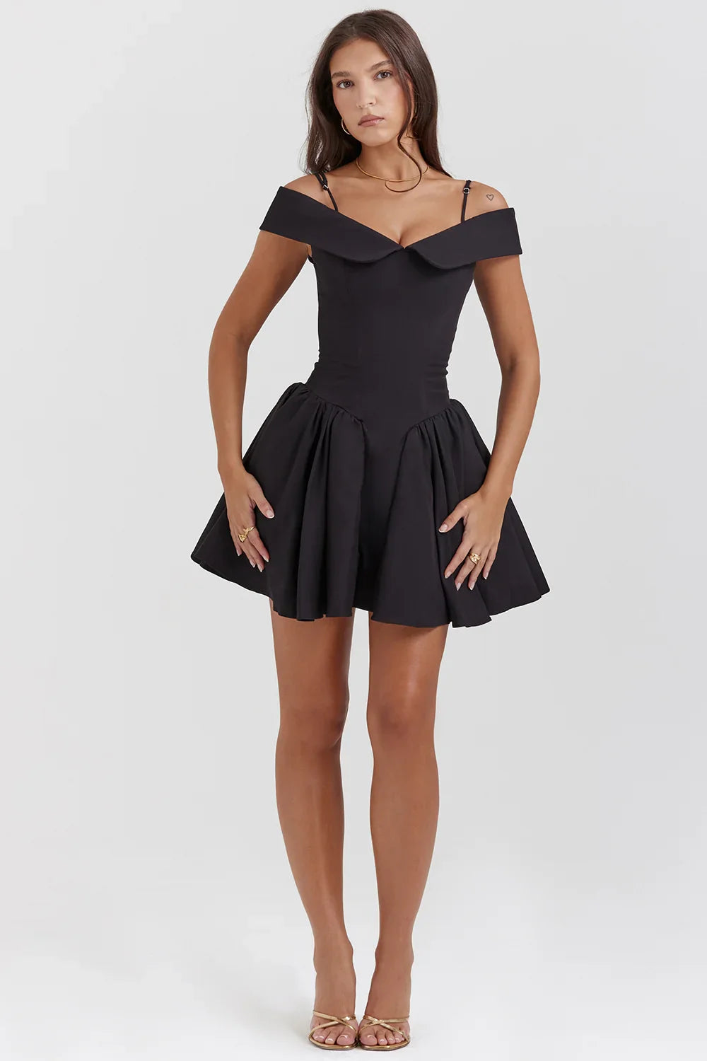 Perfect for sun-soaked brunches or moonlit evenings, this off-shoulder mini dress is sure to turn heads wherever you go. Pair it with strappy sandals and a wide-brimmed hat for a carefree daytime look, or dress it up with heels and statement earrings for a night out on the town.