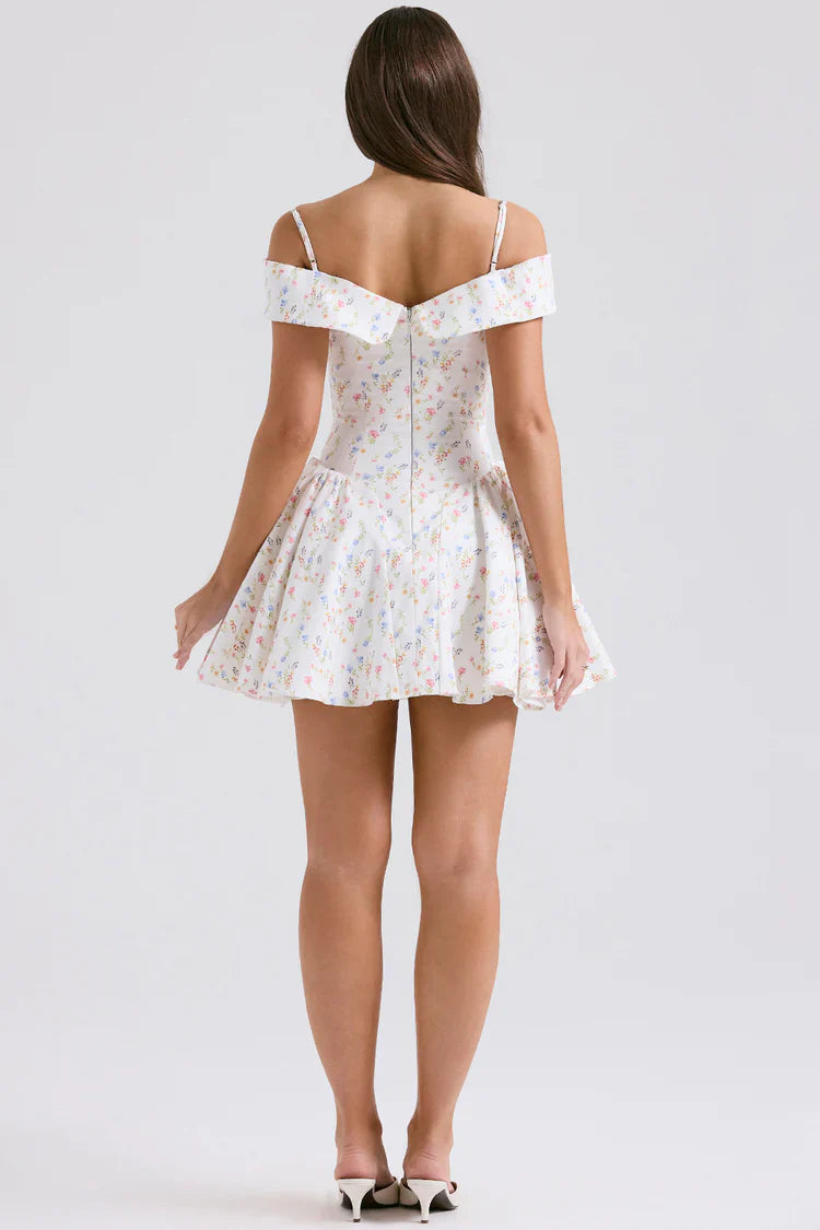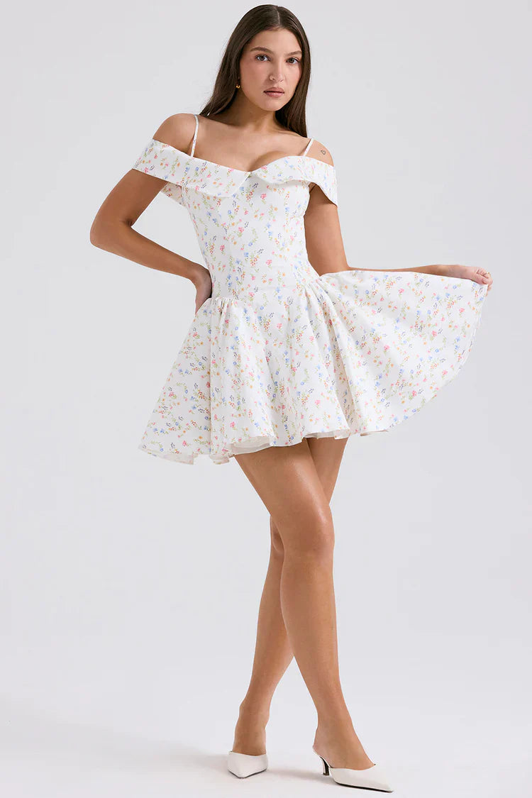 Indulge in the romance of our Cassia Off-Shoulder Floral Mini Dress – a timeless piece that captures the essence of summer and invites you to dance through life with style and grace.