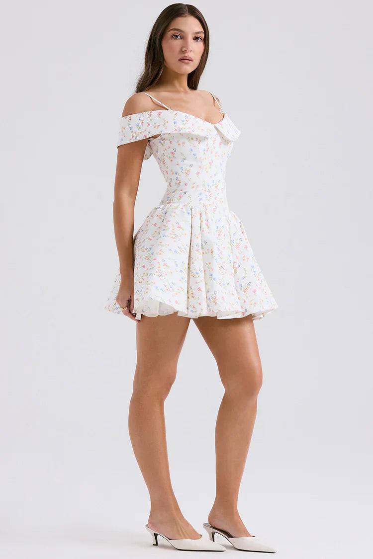 With its off-shoulder neckline and playful mini length, this dress exudes a sense of effortless allure, inviting you to embrace your inner romantic. The delicate floral print adds a touch of whimsy, while the fitted silhouette flatters your figure with every movement.
