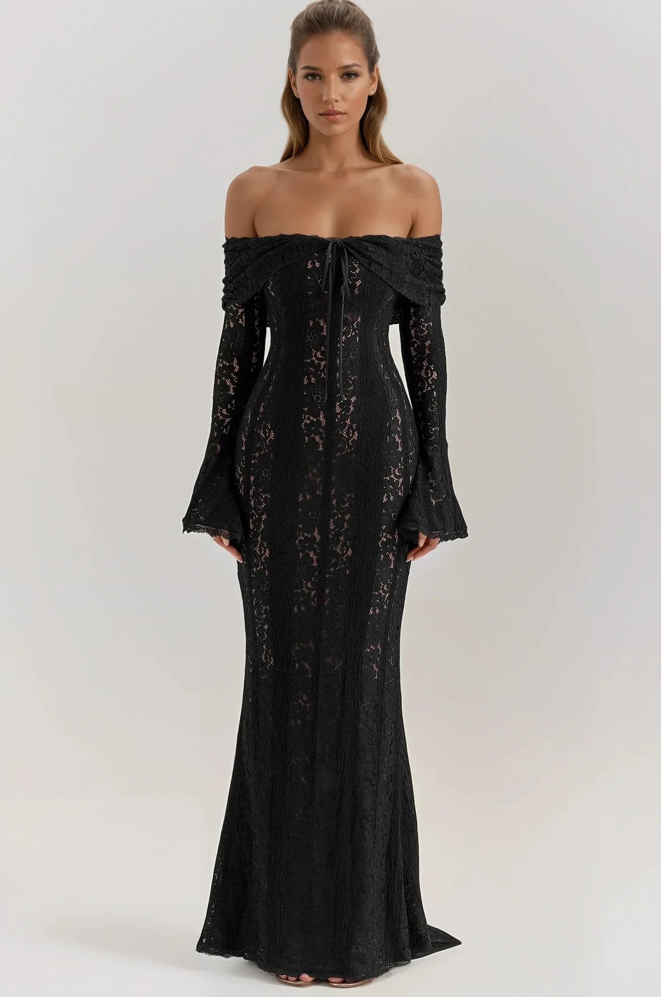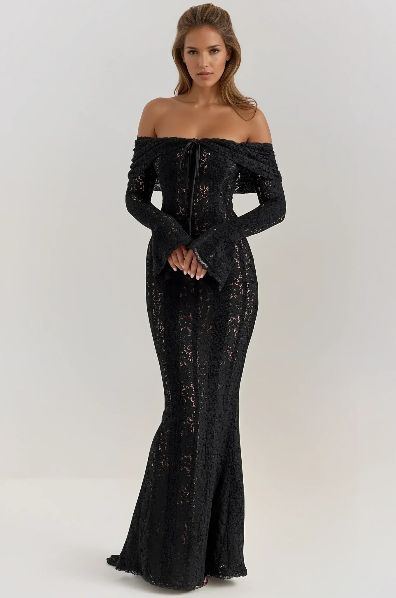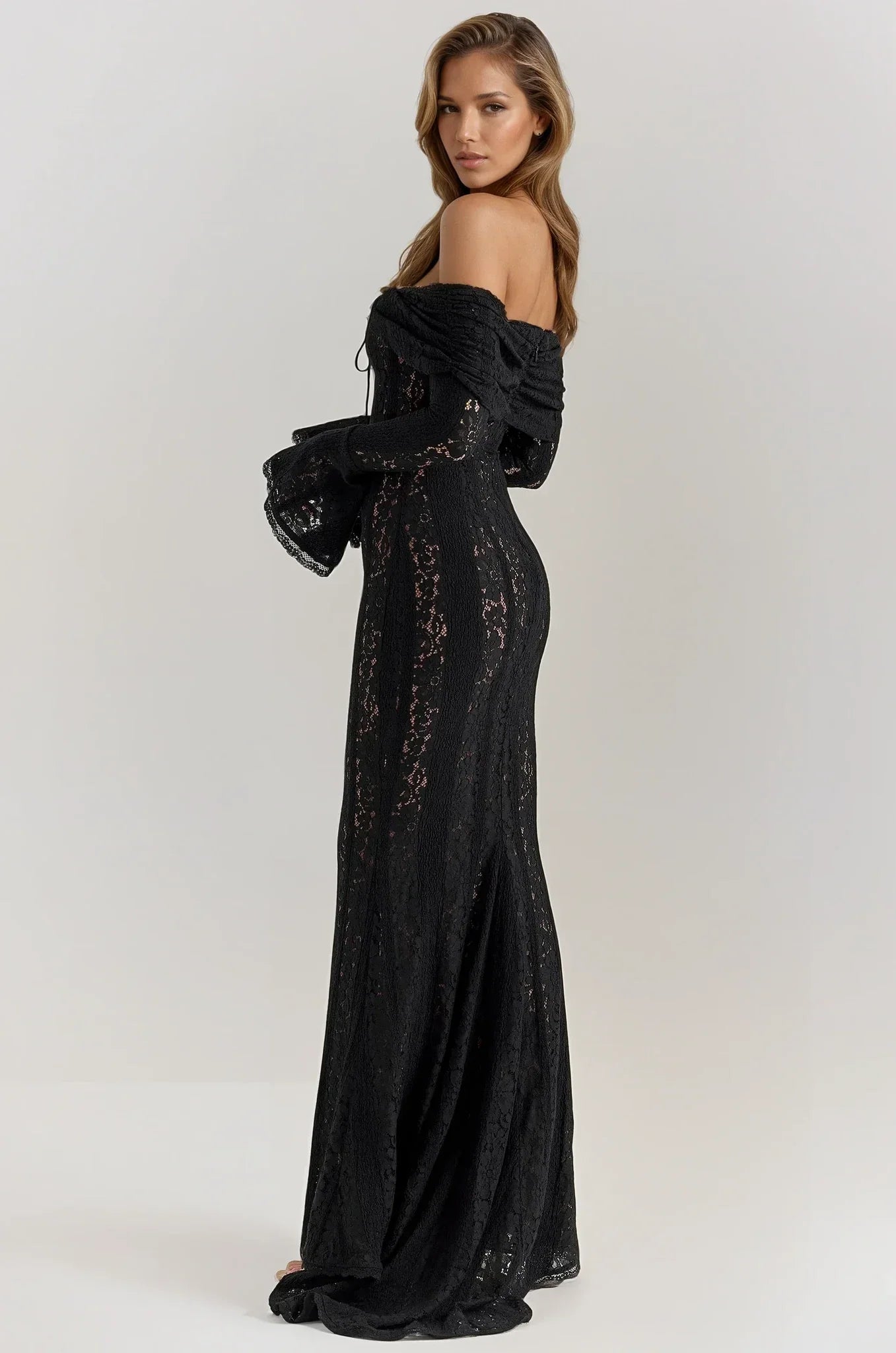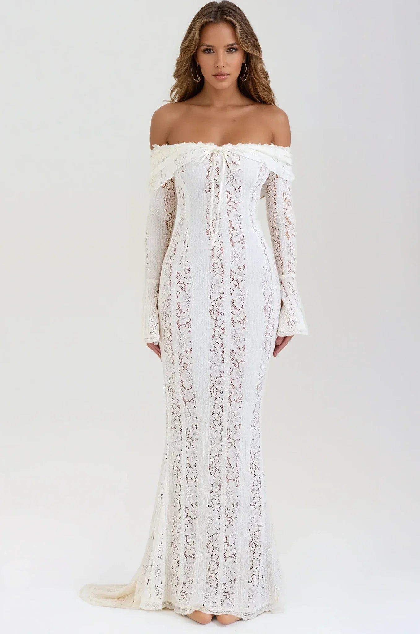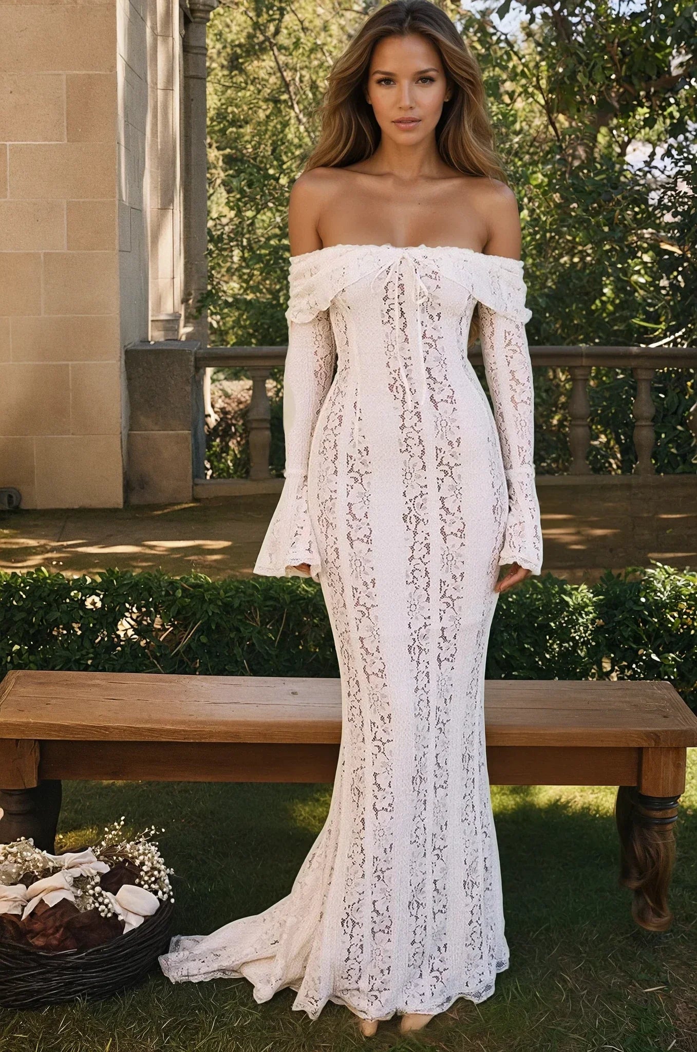 Step into effortless romance with the Celeste Off-Shoulder Lace Gown—where dreamy lace meets timeless elegance.