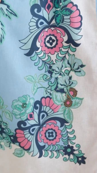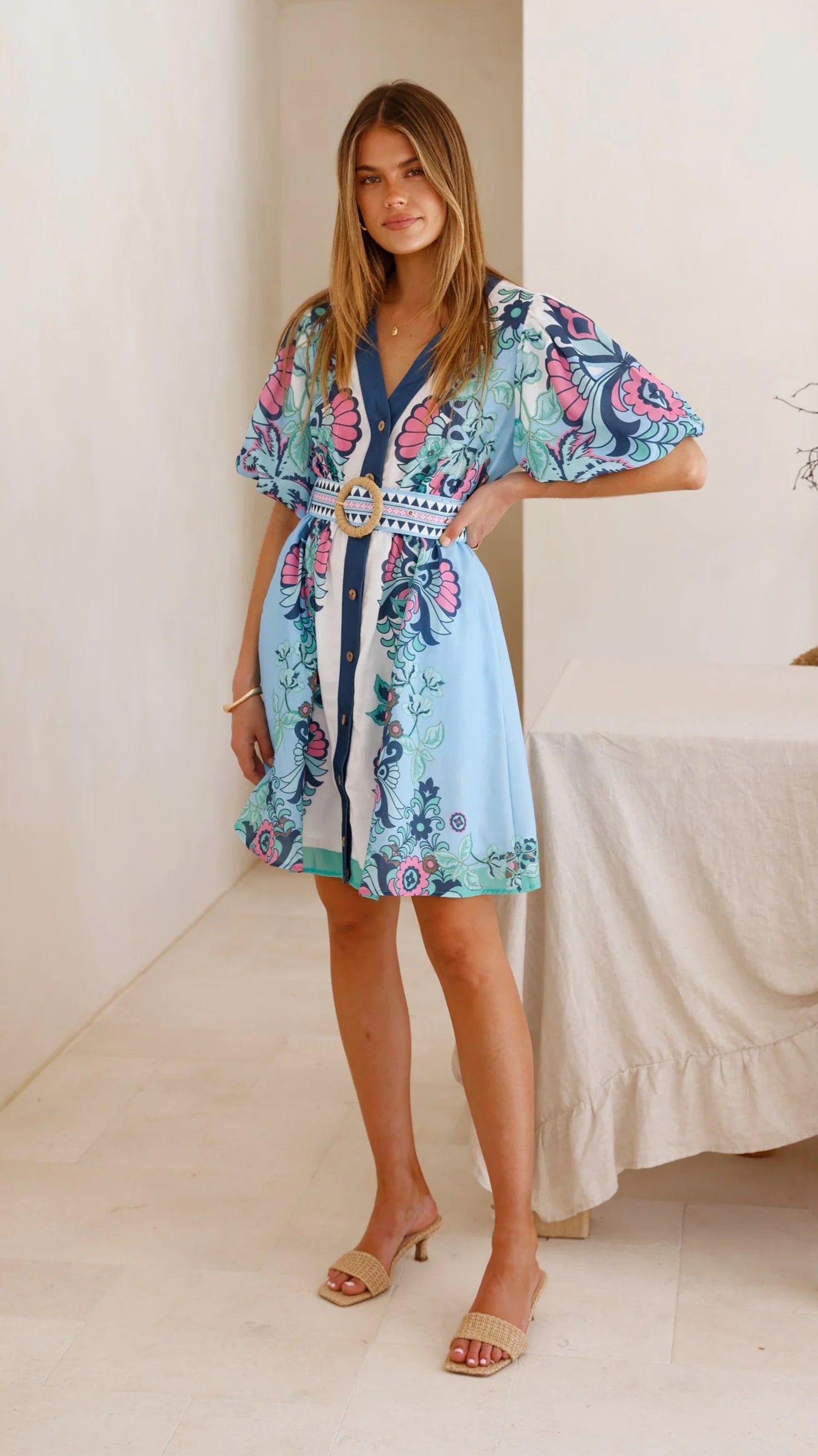 The Dali Mini Dress in Island Bloom Blue showcases a chic mini length silhouette, complete with a detachable belt and a V-neckline. It features a practical button-up front, an elasticated waist for ease, and softly puffed sleeves with elastic accents. The dress is partially lined for added comfort.