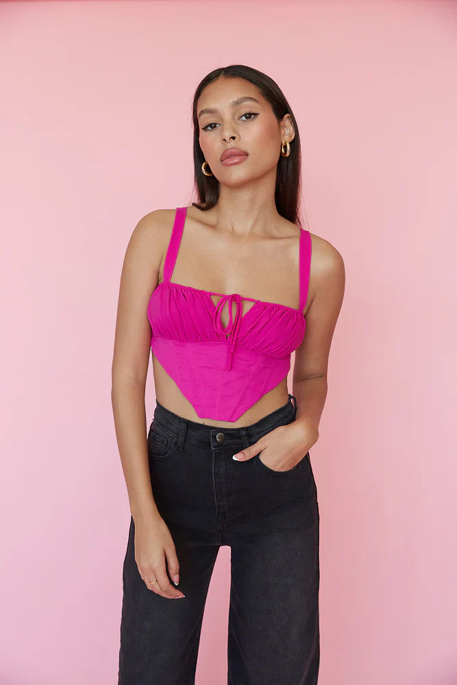 Hey dream girl, meet the Daphne Corset Crop Top! This hot piece is complete with a square neckline with a ruched tie detail, pointed hem, inner boning for a corset look, and a cropped silhouette. Available in black and fuchsia. Pair with the for a monochromatic look.