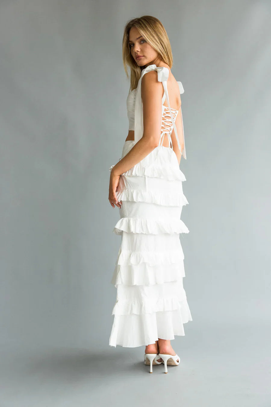 Head over heels for the Dawn Bow Strap Bustier Top + Tiered Ruffle Skirt Set! This linen matching skirt set features a feminine bustier corset top with tie bow straps, and tiered ruffle maxi skirt. to finish the look off!