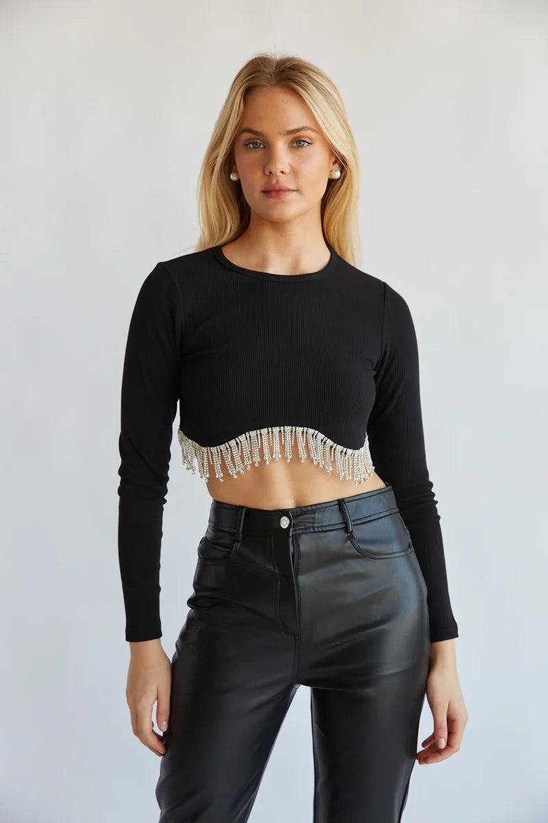 Elevate your night out look in this fun basic! The Dixie Rhinestone Fringe Crop Top features a gorgeous contour hem bejeweled with rhinestone fringe, a crew neckline, comfy rib knit fabric, and long sleeves. Complete this casual, edgy look with the .