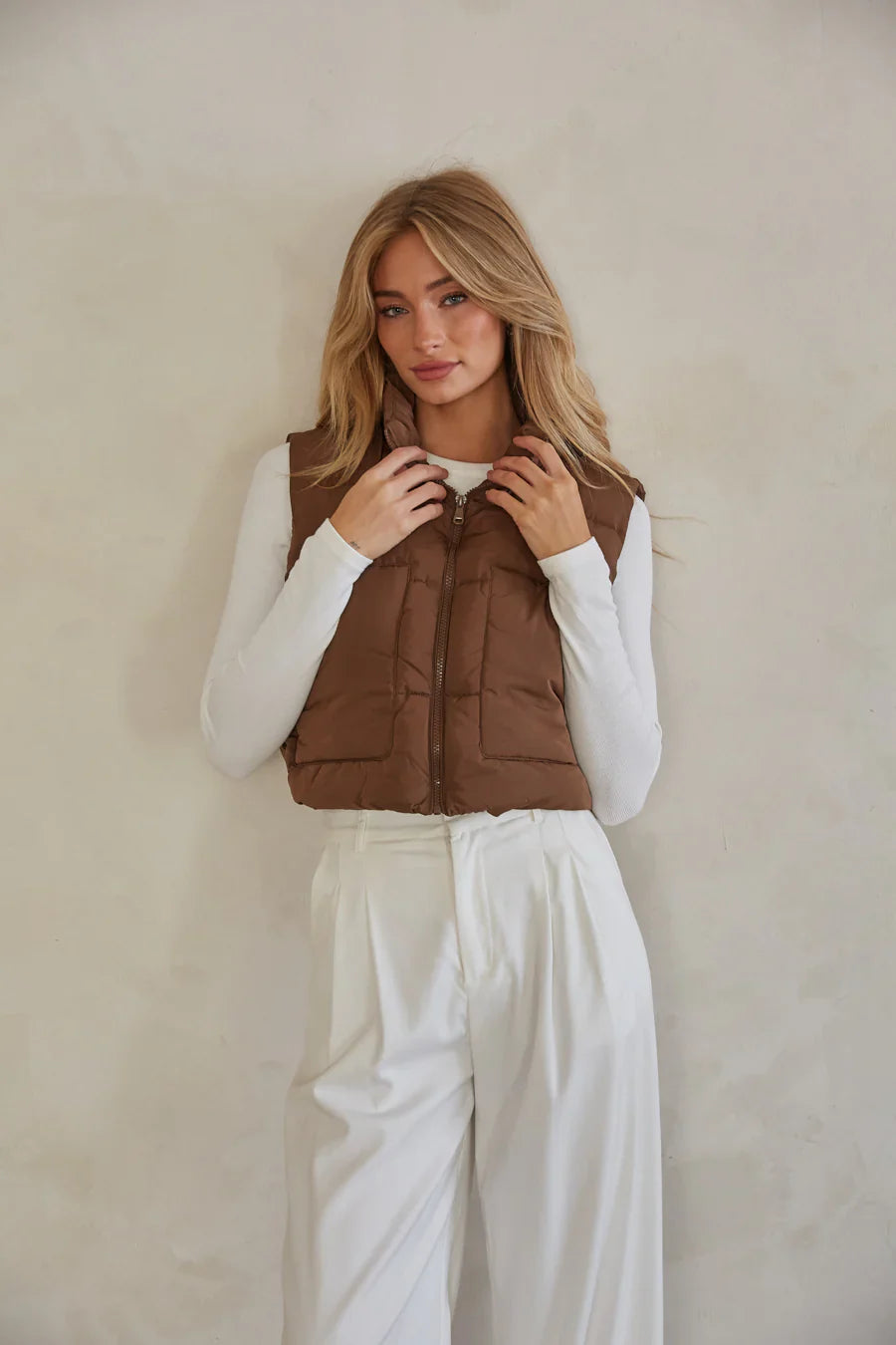 Layer up in the Emma Puffer Vest! This cozy piece features a butter soft fabrication, front pockets, plush padded make. Available in Brow, style with a long sleeve for a Winter ready look!