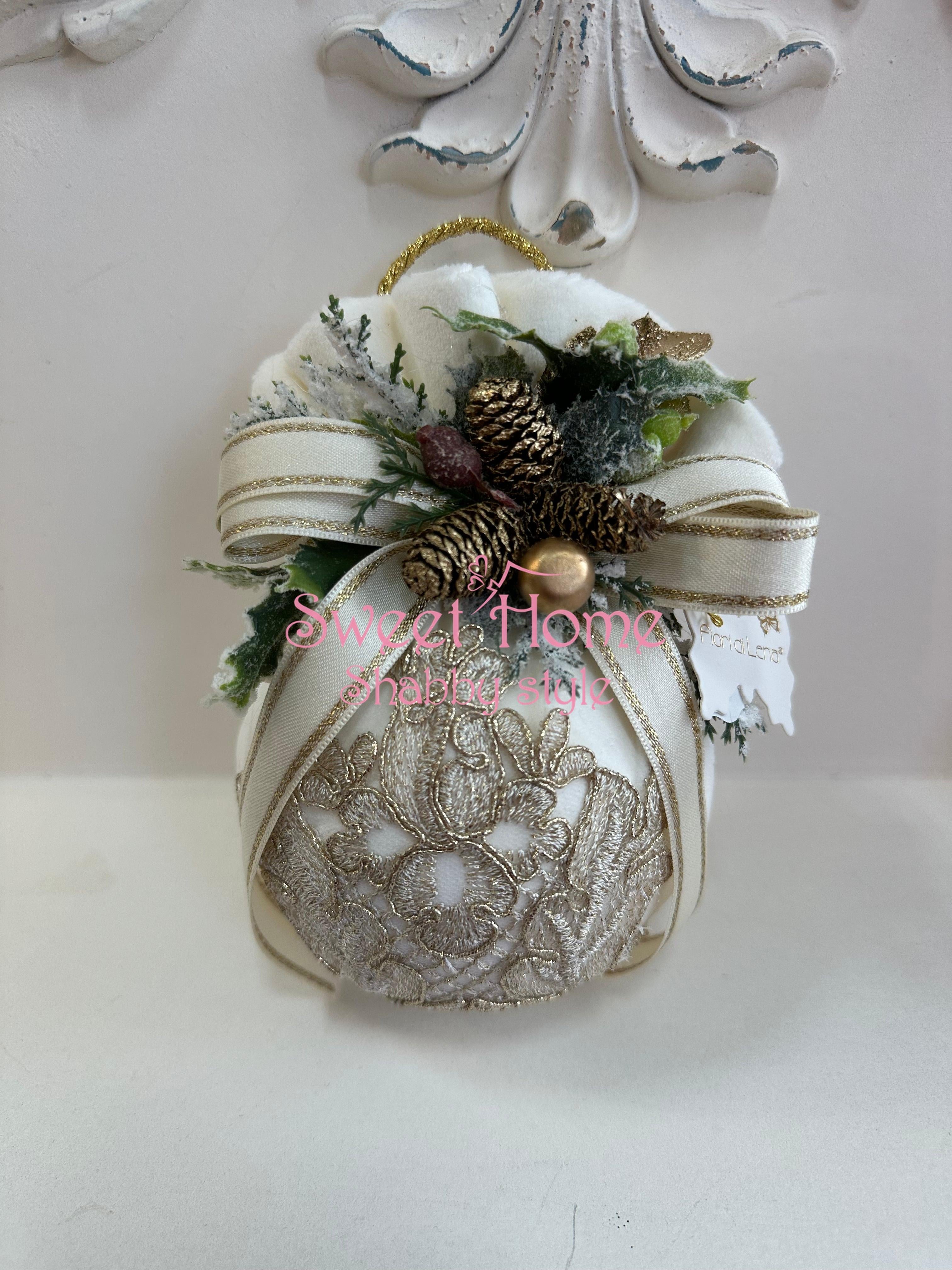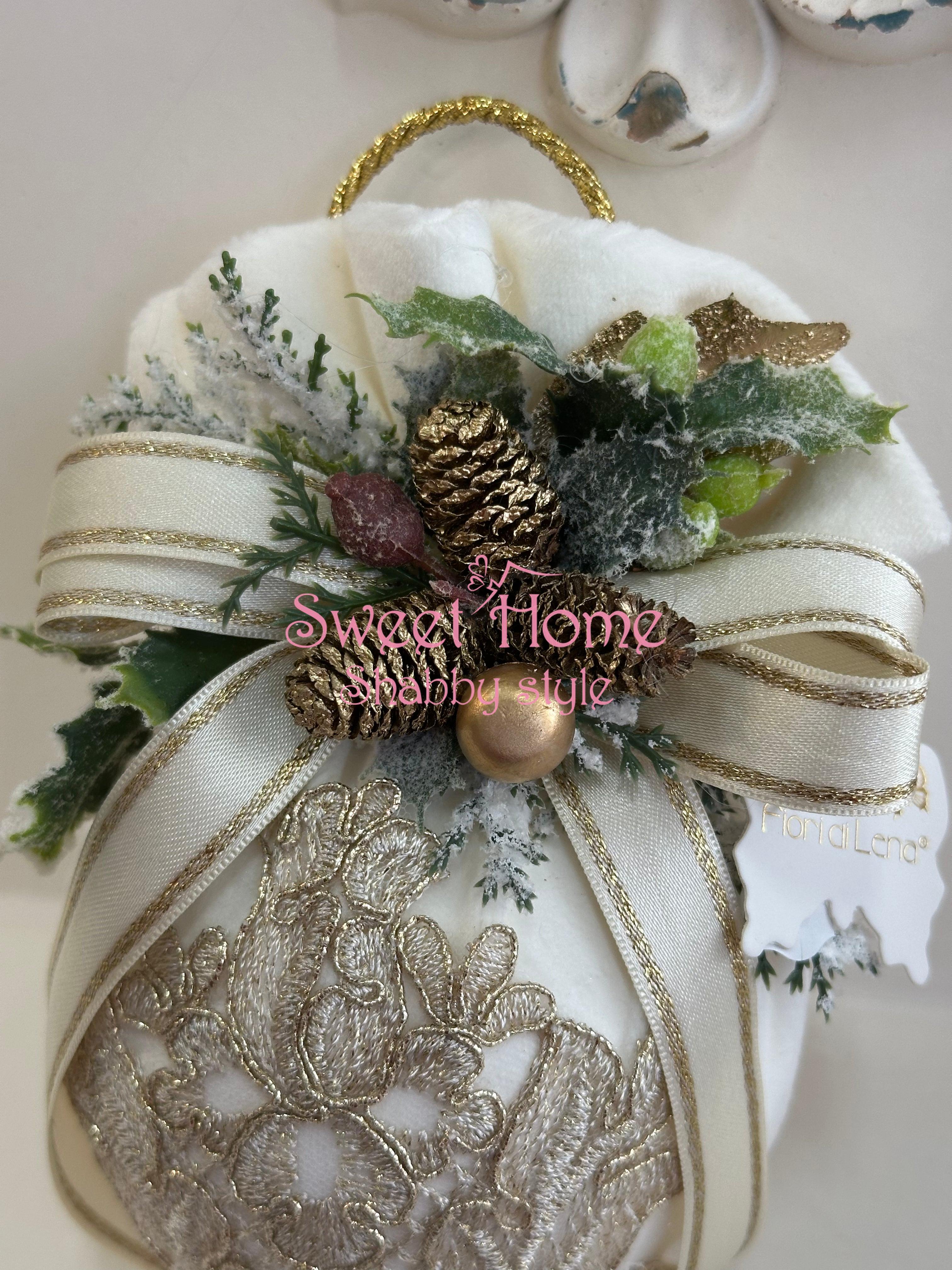 Aggiungi un tocco di eleganza e bellezza al tuo albero di Natale con la nostra Pallina Natalizia FIORI DI LENA. Realizzata con morbido velluto e delicato pizzo, questa sfera porta un'atmosfera di festa in ogni angolo della tua casa. Prodotto artigianale made in Italy.