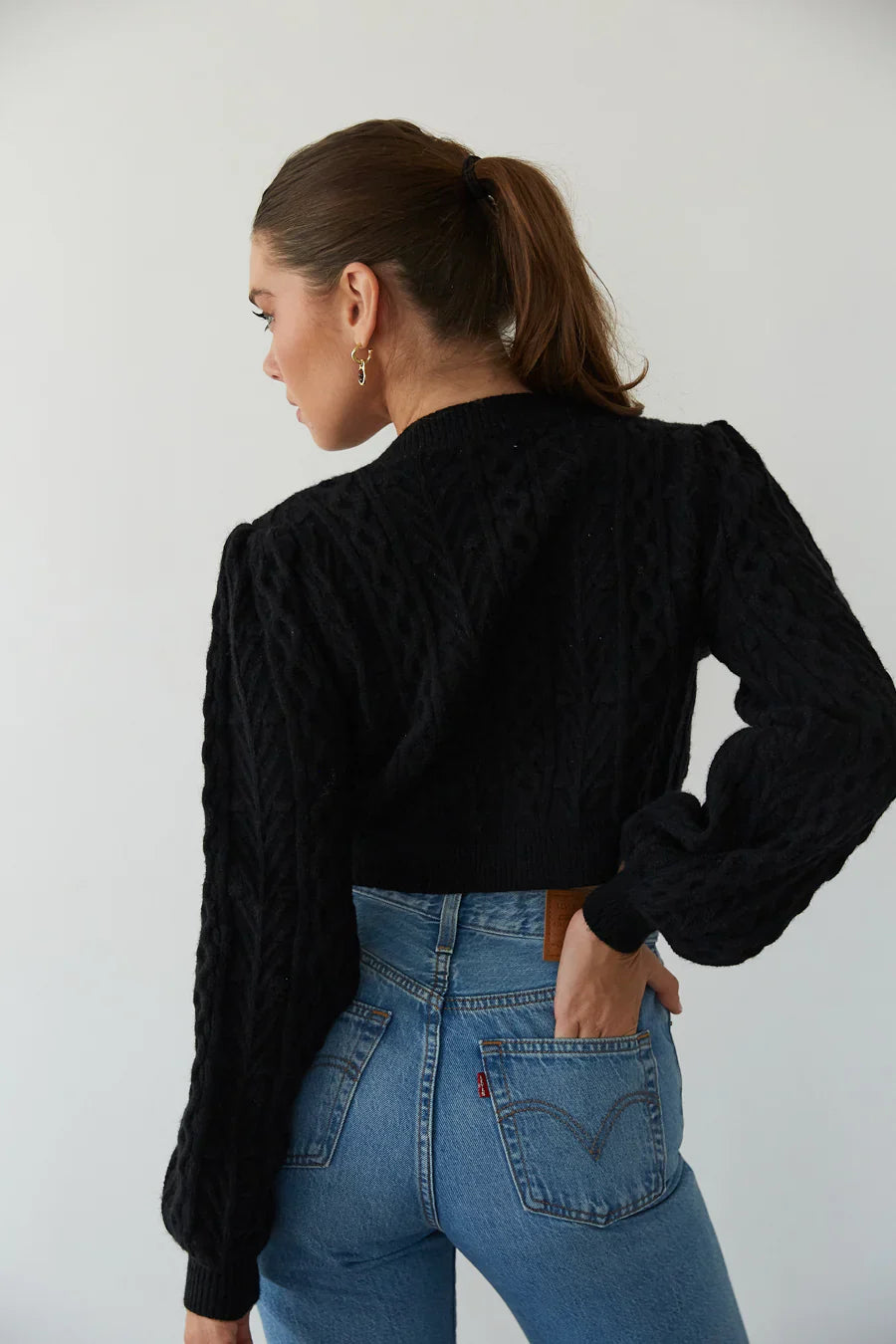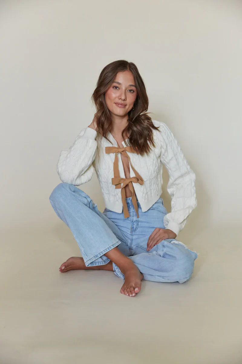 Be at your toastiest in this sweet and special cardigan! The Florence Cable Knit Bow Cardigan is a cozy dream. Featuring an open front with tan bows, a cropped silhouette, cuffed balloon sleeves, and thick cable knit material. Style with your  and  for an effortlessly femme look.
