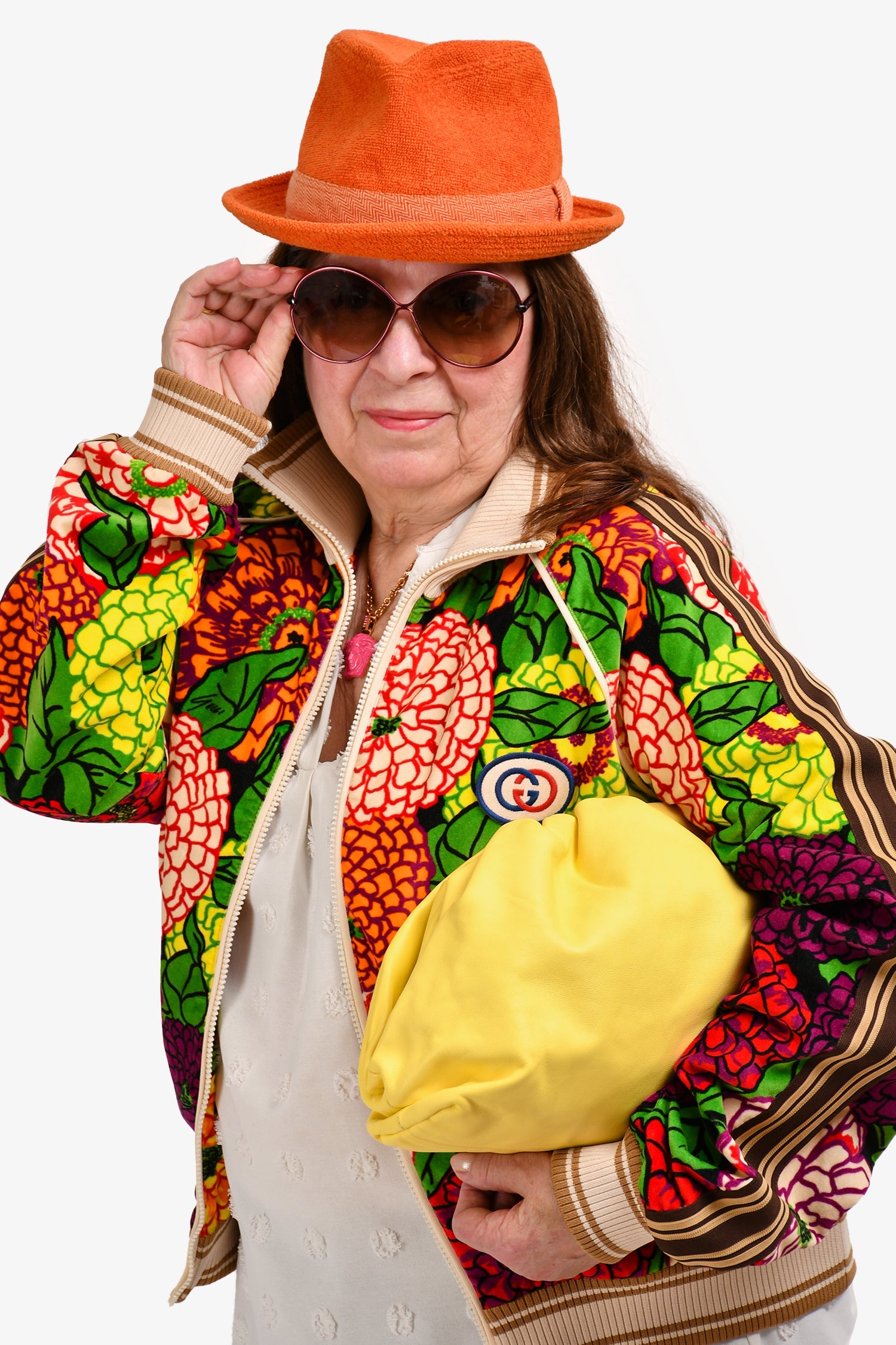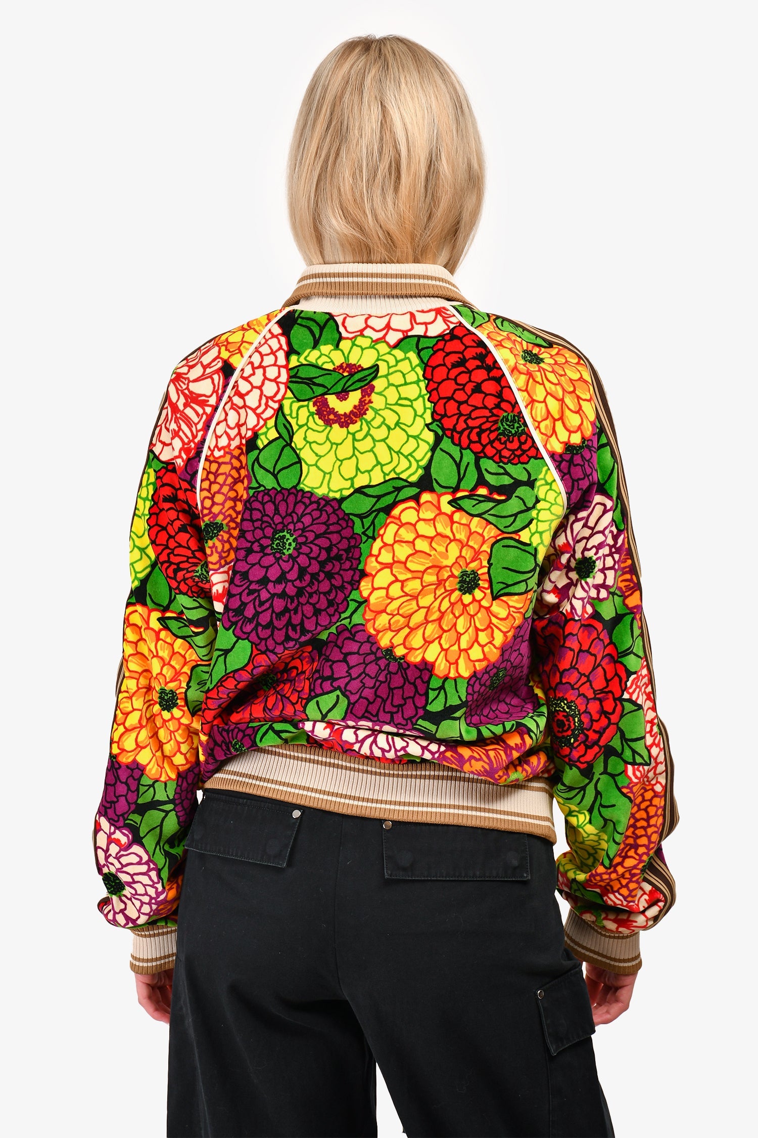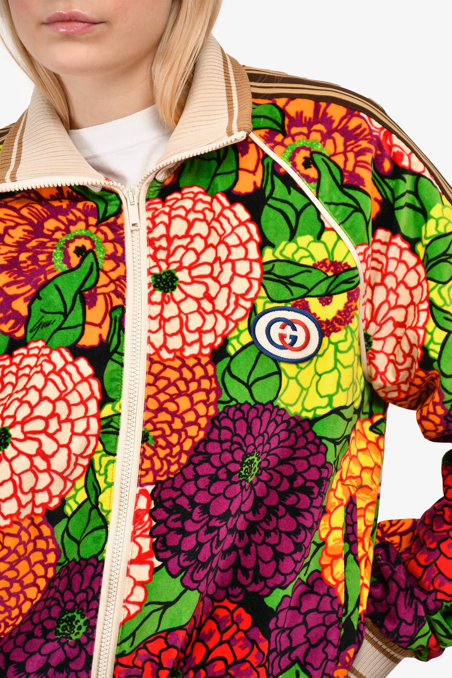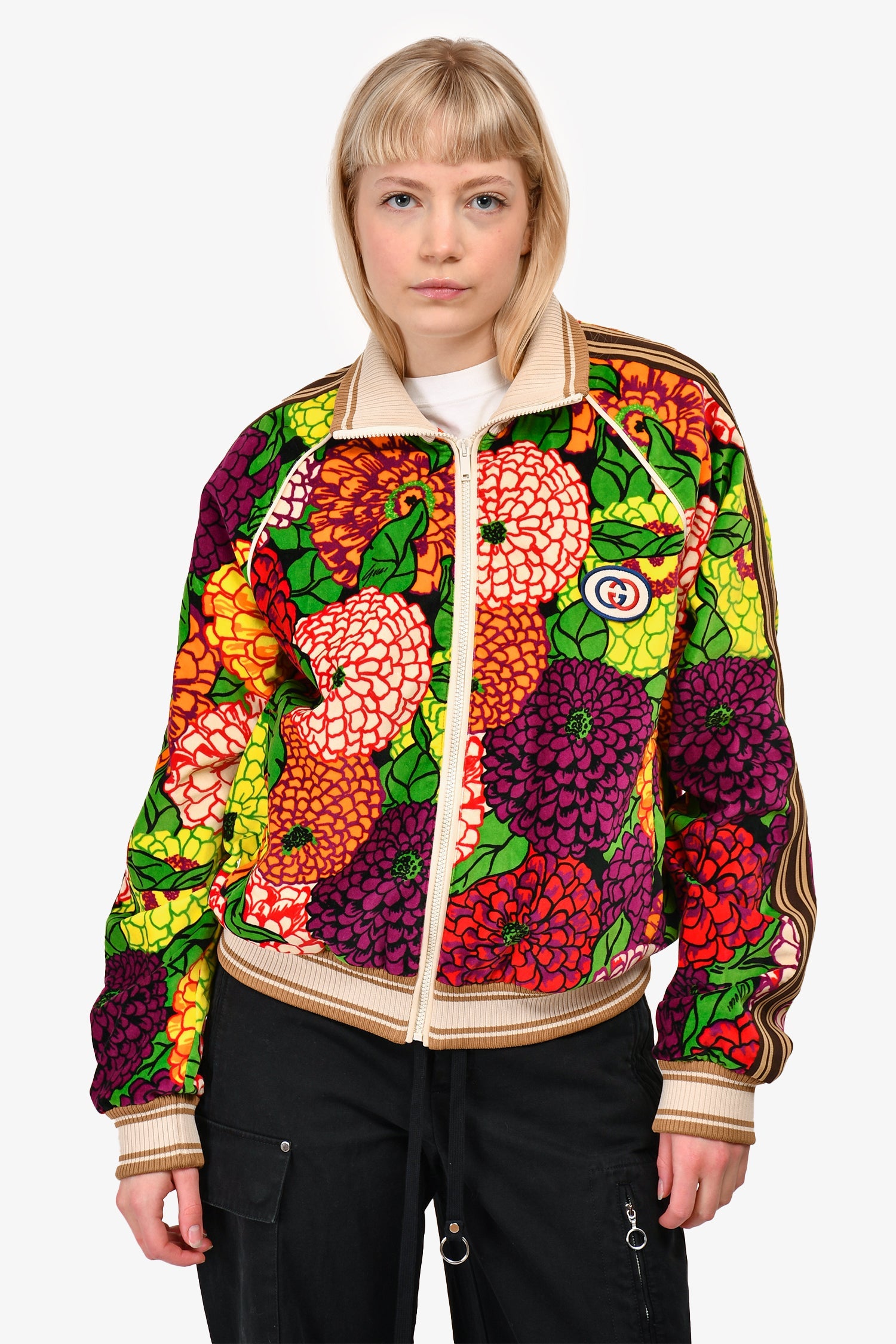 Gucci x George Kenneth Scott Green/Purple Floral Velour Zip-Up Jacket. Front white-tone zip-up. Ribbed collar, cuffs, and waistband. Mesh lining. Contrast stitching.
