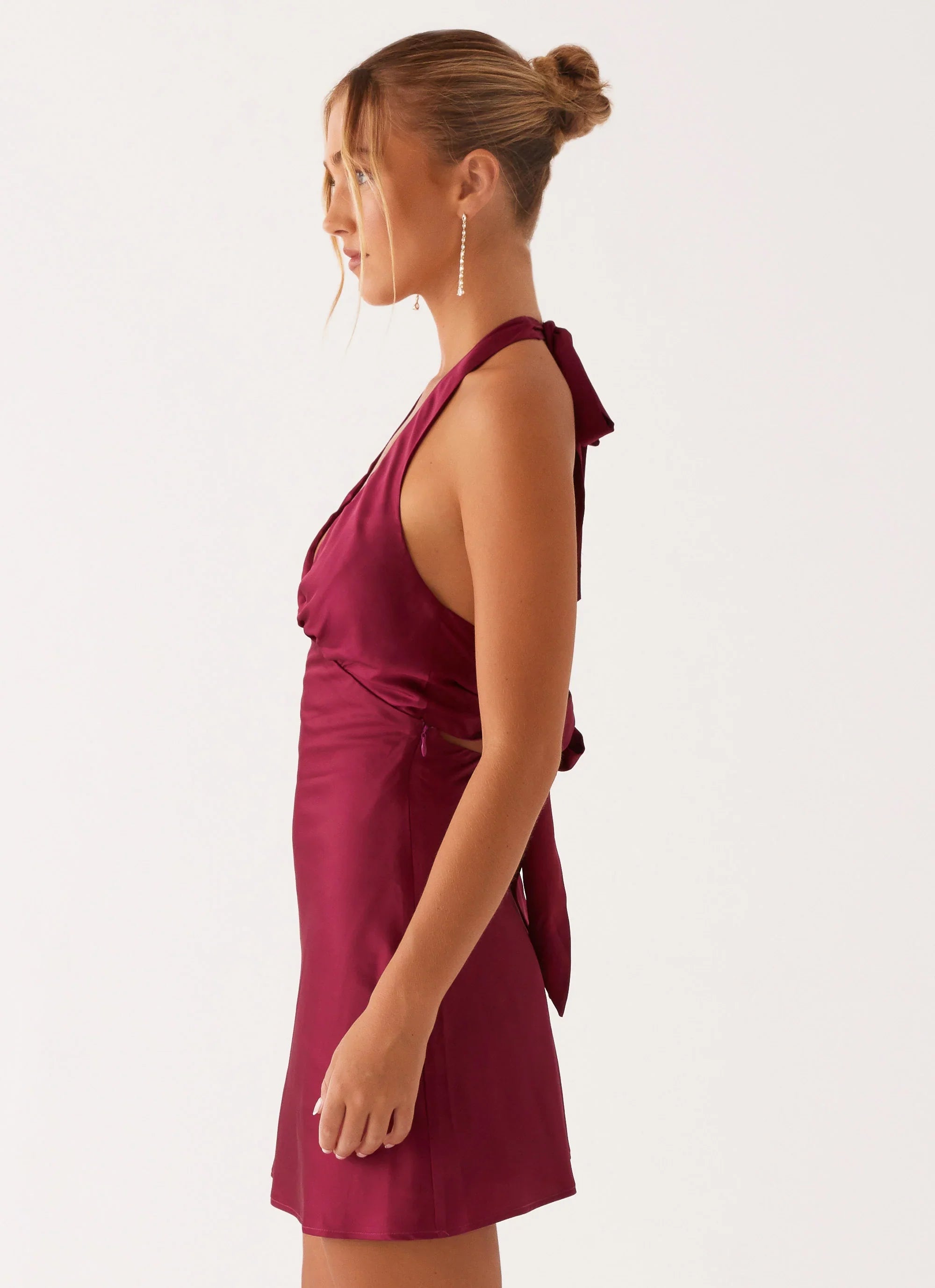 Unveil your bold side with the Heavy Hearted Mini Dress. Crafted with a flattering bias cut. this dress hugs your curves while the tie at the neck adds a touch of sophistication. The open low back brings an element of allure. perfect for making an unforgettable entrance.