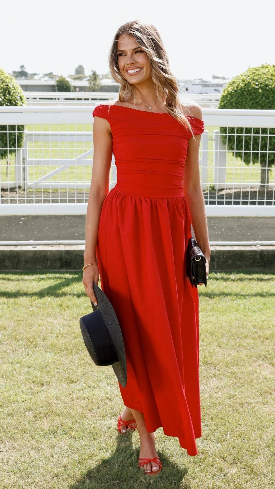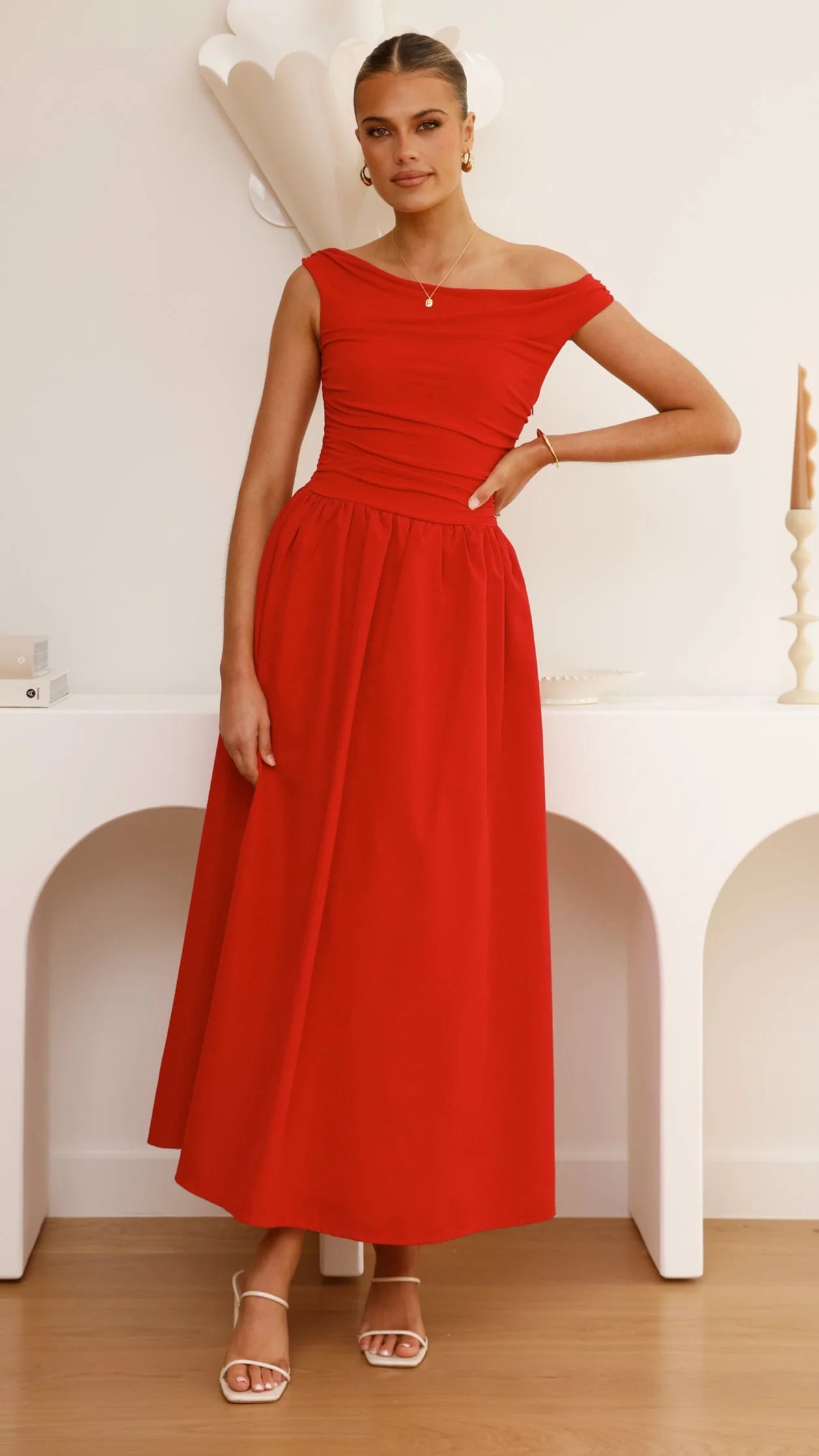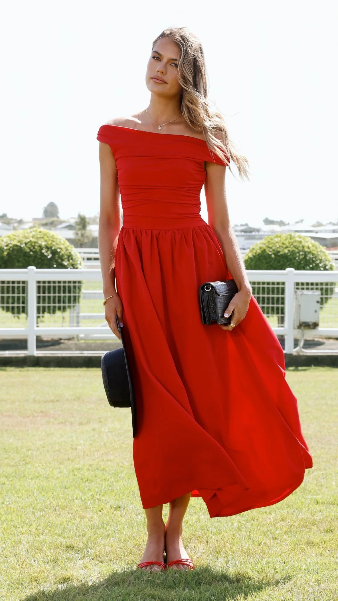 This elegant midi dress in red features an off-shoulder design that highlights the neckline with refined sophistication. Side ruching along the top enhances the silhouette, while an invisible side zip ensures a smooth fit. Silicone gripping at the bustline provides secure comfort, and the fully lined construction adds a luxurious feel.