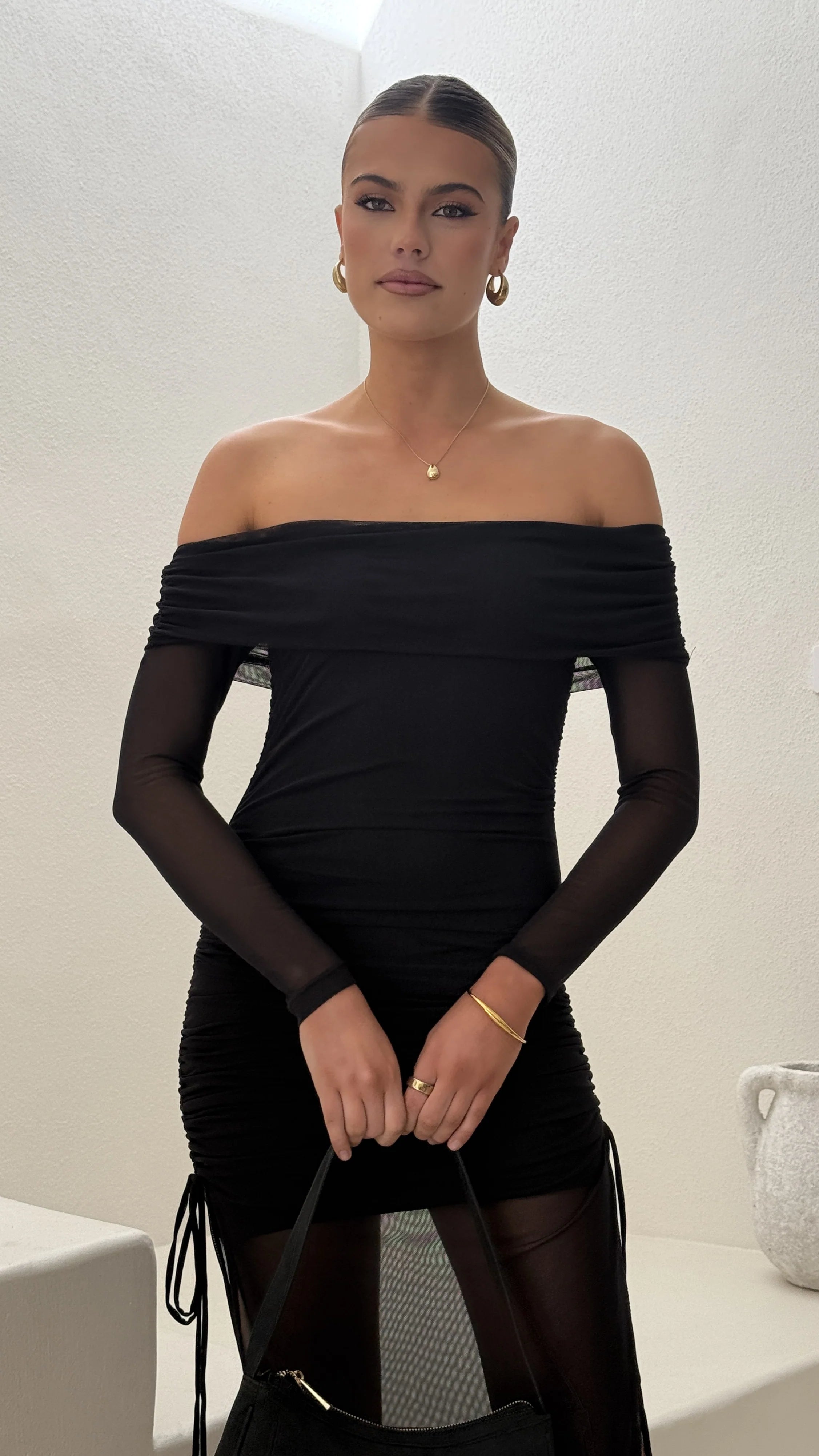 This maxi dress showcases an off-shoulder neckline with fully gathered sides and adjustable side ties to customize the length. It is fully lined for comfort, features sheer sleeves, and includes silicone grip at the bust to ensure a secure fit. Designed with elegant side splits starting at the knee, enhancing both style and movement.