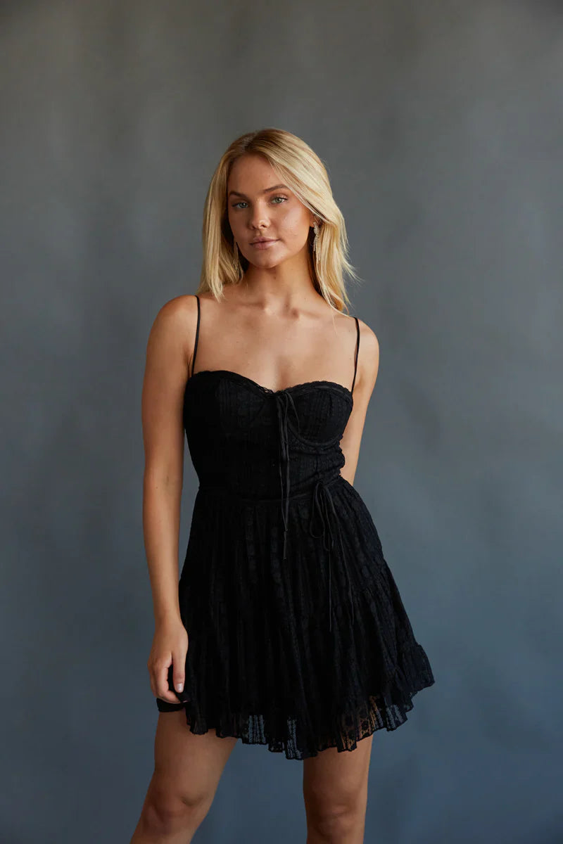 Doesn't get any sweeter than you in the Ivy Lace Bustier Babydoll Mini Dress! This gorgeous dress features a bustier style bodice with an adjustable tie waistband, tiered skirt, lace overlay, front tie detail, and adjustable spaghetti straps. Available in black and cream. Finish off the look with your favorite !