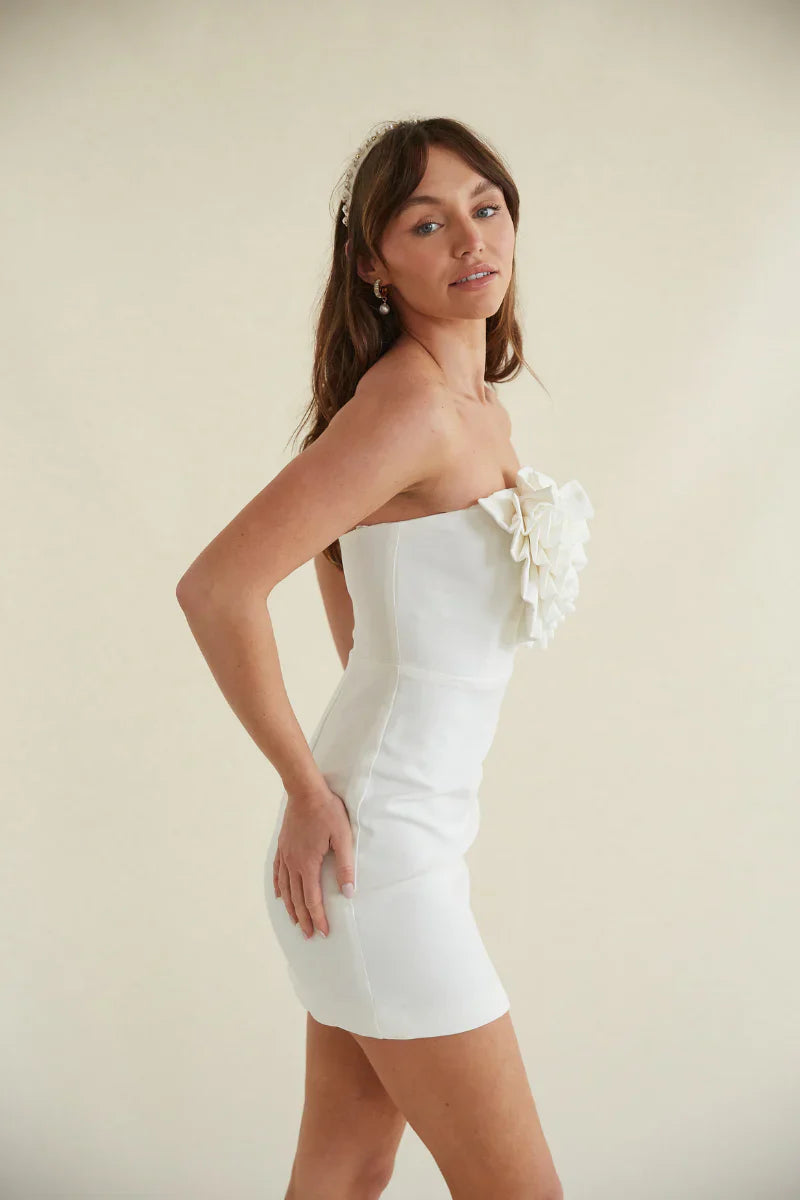 The Julianna Ruffle Rose Mini Dress is the statement piece your closet needs! This gorgeous strapless mini dress features an oversized 3D rose appliqué at the bust and a straight across neckline. Available in pink and white. Pair with a simple to complete the look!