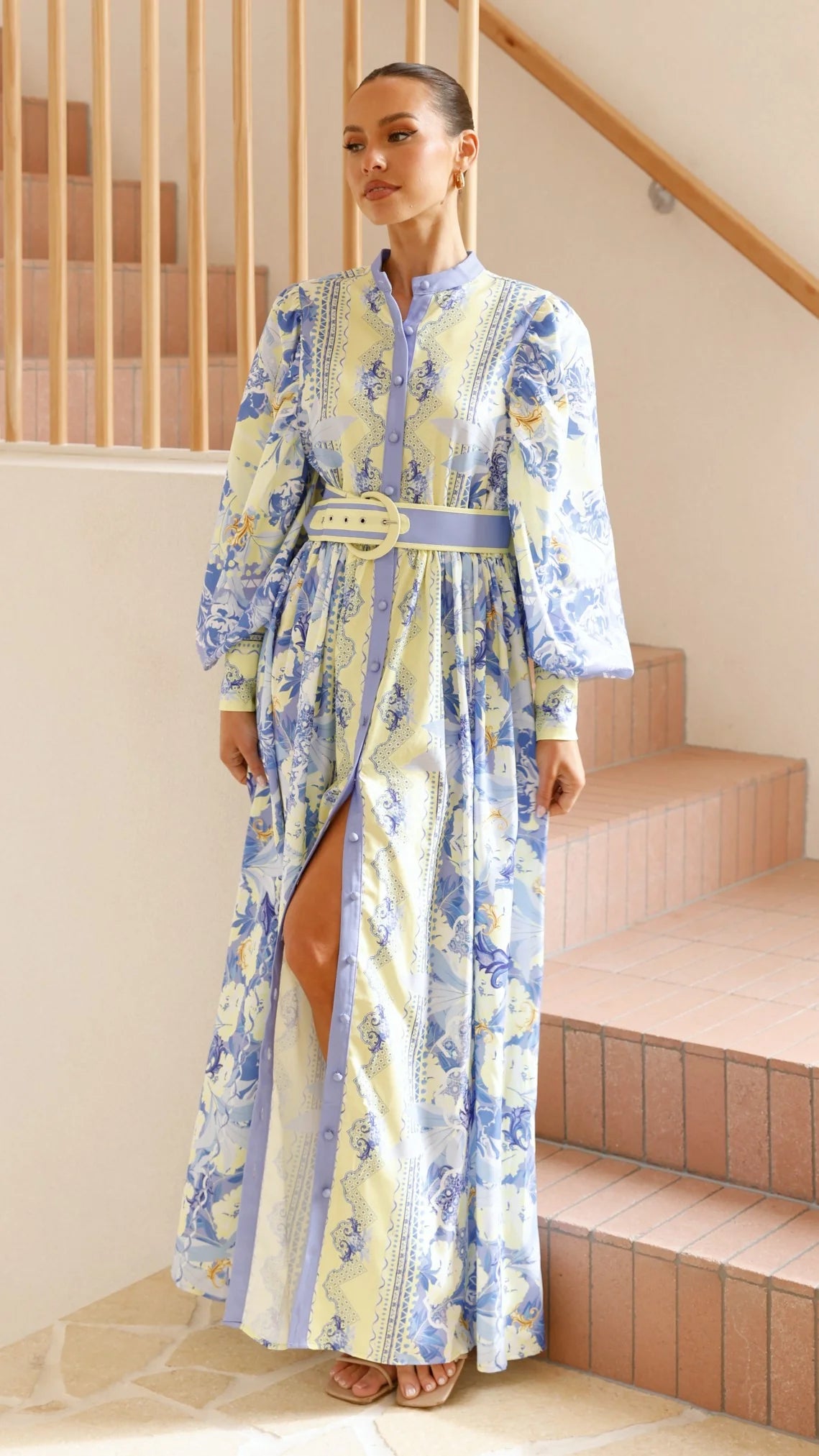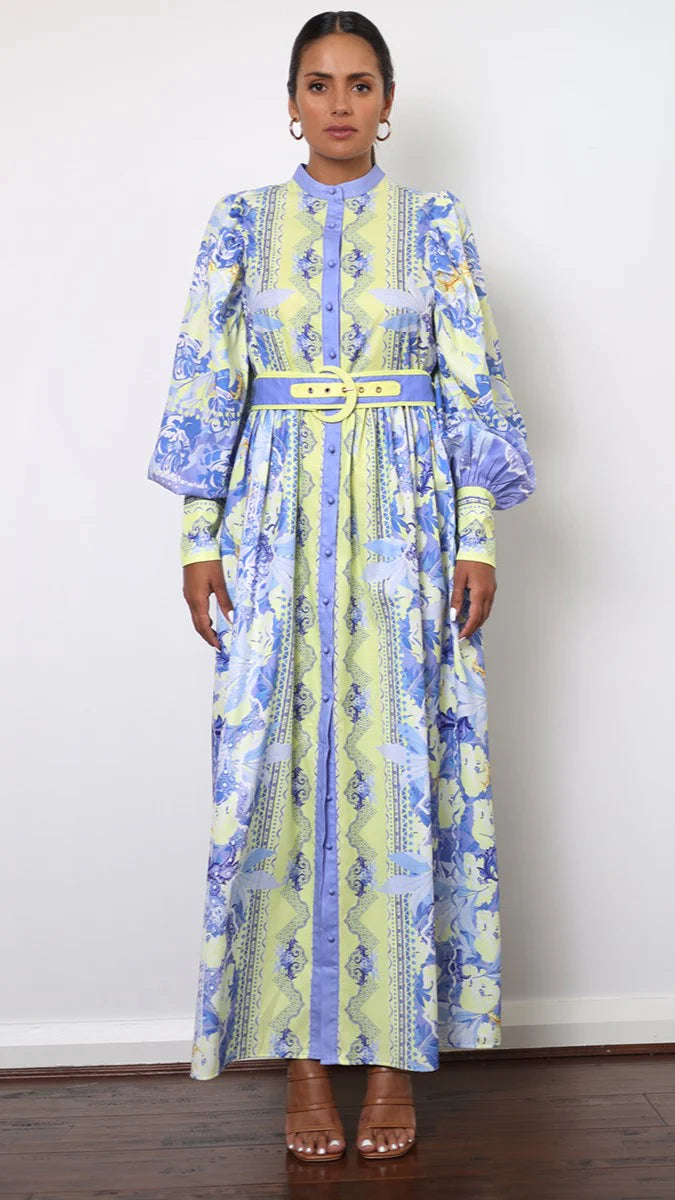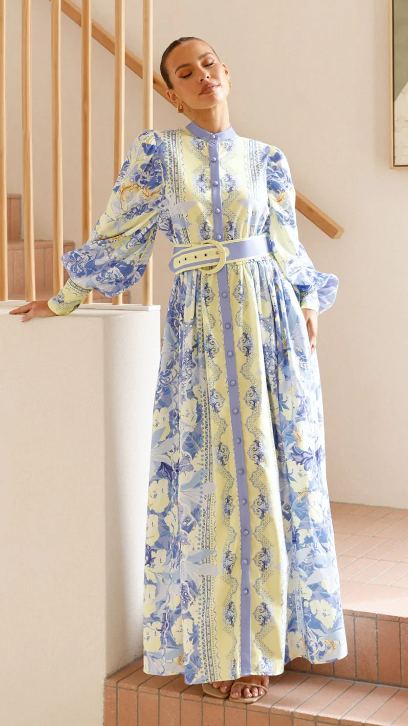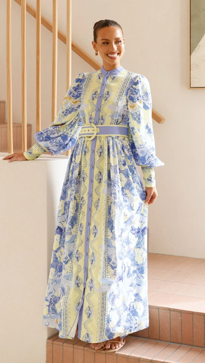 This maxi dress features a Mandarin-style collar and long balloon sleeves with buttoned cuffs. It has covered buttons down the front, a delicate elasticated waistband, and a detachable waistbelt, creating a refined silhouette in striking blue and yellow hues.