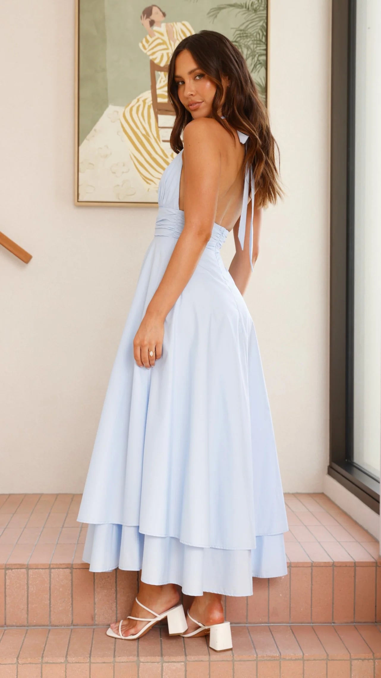 This elegant Kathy Halter Neck Maxi Dress in light blue features a flattering halter neck tie and a defined waistband with subtle fold details. The invisible center back zipper ensures a seamless fit, while the bust lining offers comfort and support. Perfect for sophisticated occasions.
