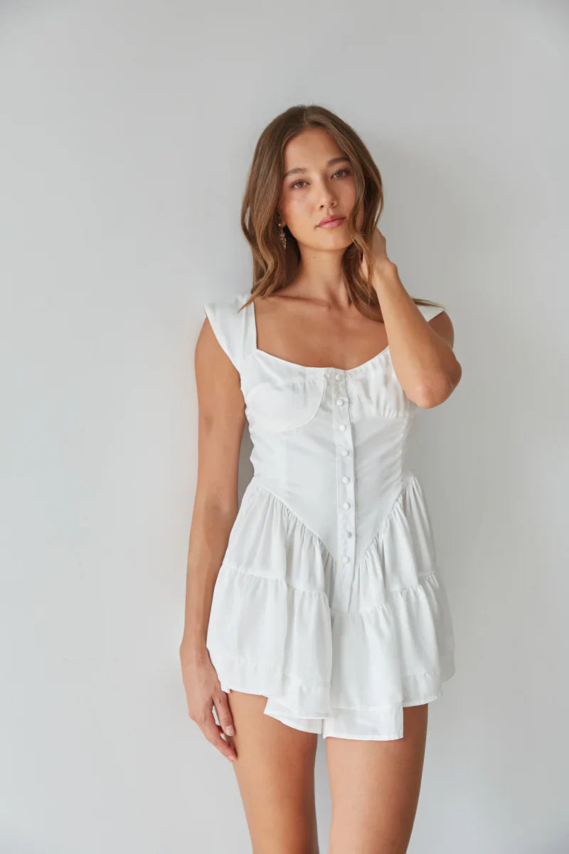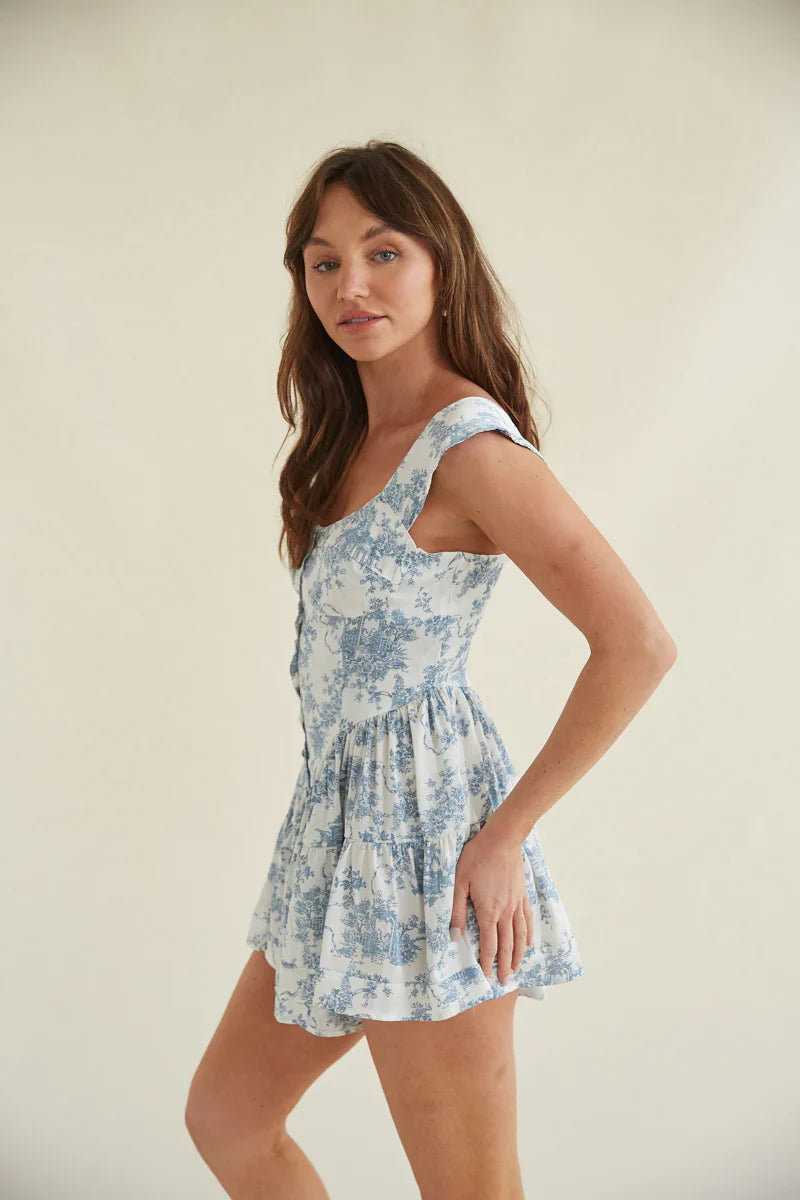 Sweeten up your style with the Kaylyn Bustier Button Romper! This adorable romper features a button front closure, ruffle hem, and sewn bustier design. Available in blue toile and white. Pair with a chic to complete the look!