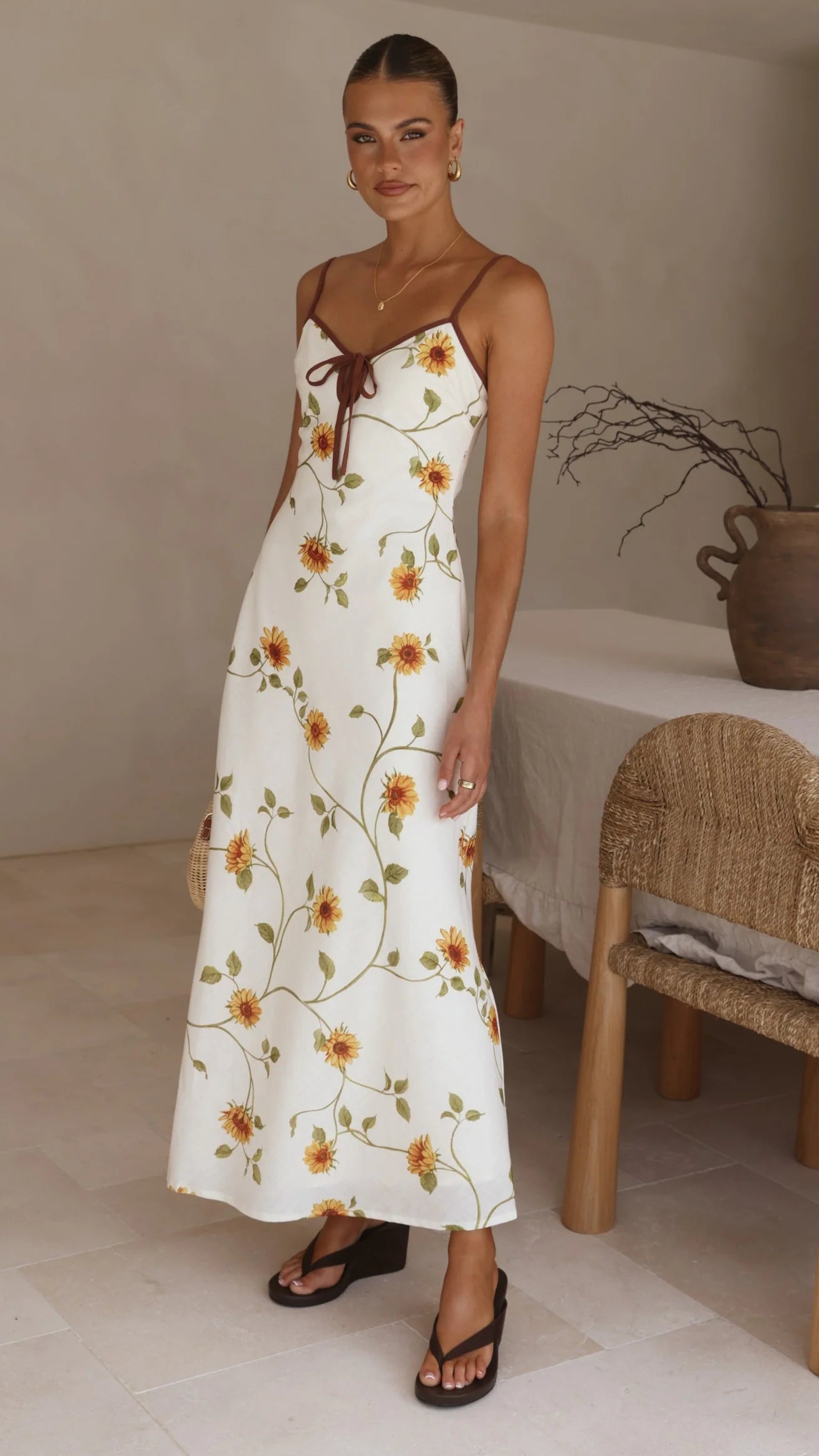 The Koko Maxi Dress in Sunflower offers a sophisticated silhouette with adjustable thin straps for a perfect fit. Featuring elegant brown trimming detail and a flattering bust tie, this dress combines timeless style with subtle accents.
