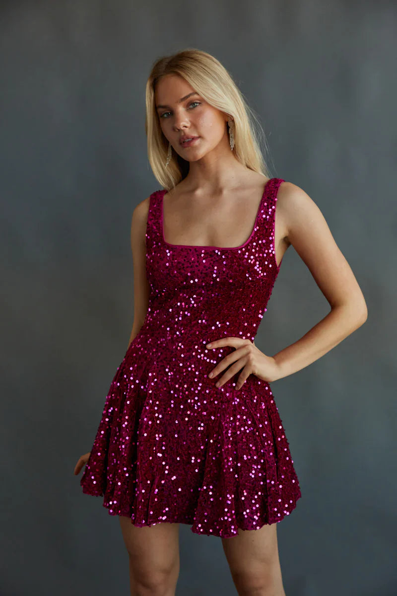Look effortlessly femme and flattering in the Lacy Velvet Sequin Skater Mini Dress! This cute mini dress features all over sequins with a soft velour fabric, a square neckline, and a fit and flare silhouette. Pair this flirty dress with a for a hoco ready look!
