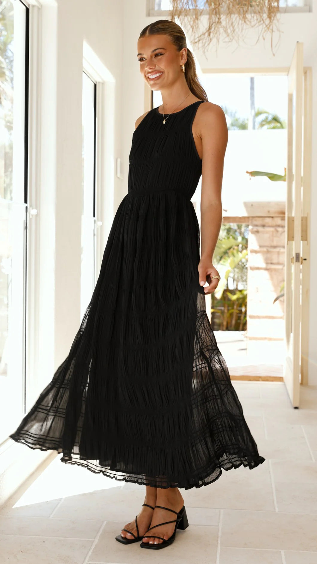 The Lassie Maxi Dress in Black features a sleeveless design with a classic crew neckline, enhancing its elegant silhouette. Crafted from textured, sheer fabric and fully lined for comfort, it offers a refined layering effect. The removable waist tie allows for a customised fit.