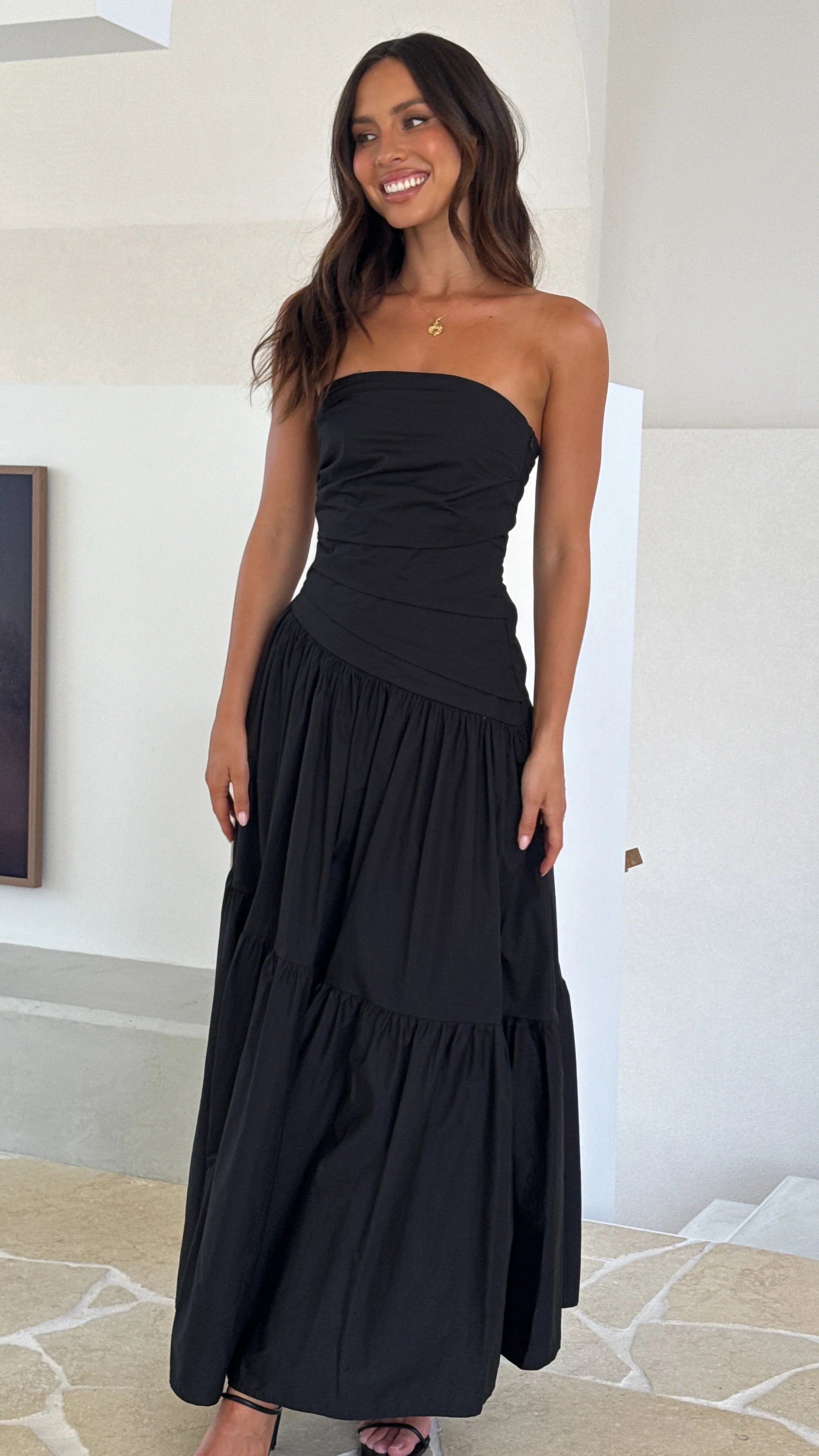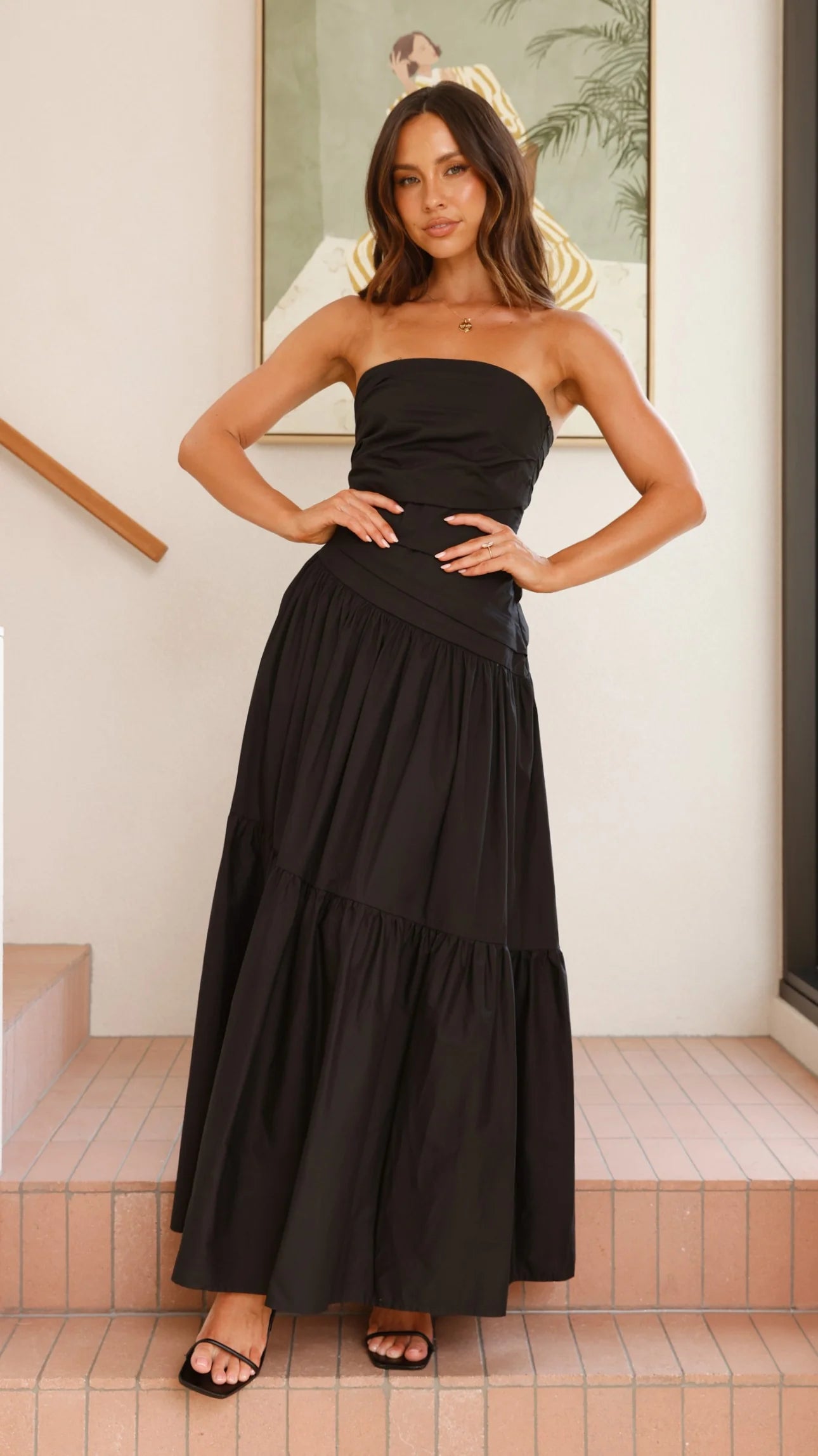 This elegant maxi dress features a strapless silhouette with a silicone grip strip inside the bust for secure wear. It showcases a ruched bodice and an asymmetrical waistline, complemented by tiered layers on the skirt. The design includes an invisible side zipper and is partially lined for comfort. Crafted from 100% cotton, it balances sophistication with breathable ease.