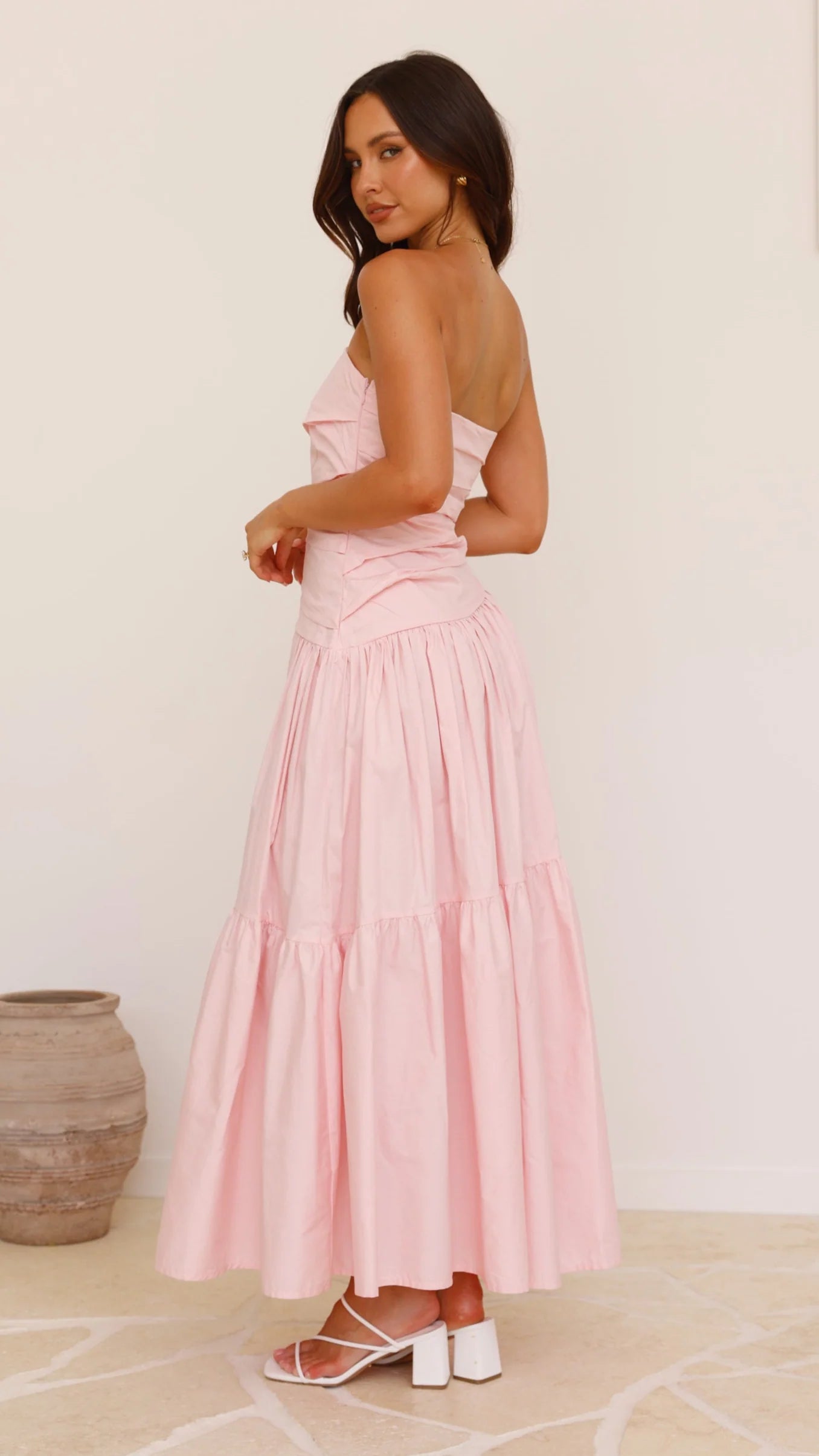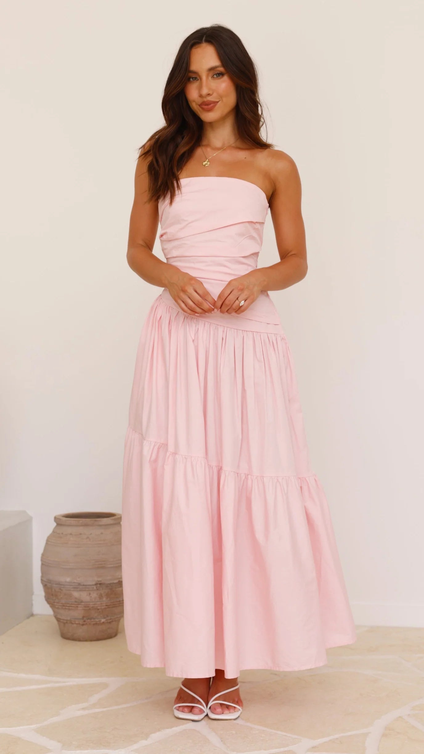 The Lola Maxi Dress in pink offers an elegant strapless silhouette enhanced by a silicone grip strip ensuring a secure fit. Its ruched bodice and asymmetrical waistline create a flattering shape, while tiered skirt detailing adds graceful movement. Partially lined for comfort, the dress features an invisible side zip for a seamless finish.