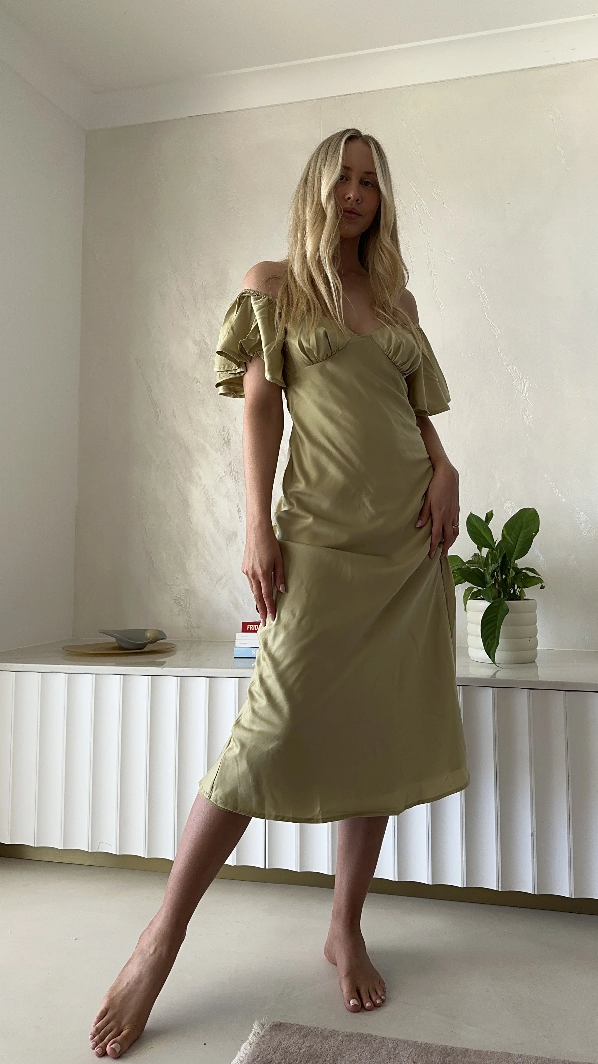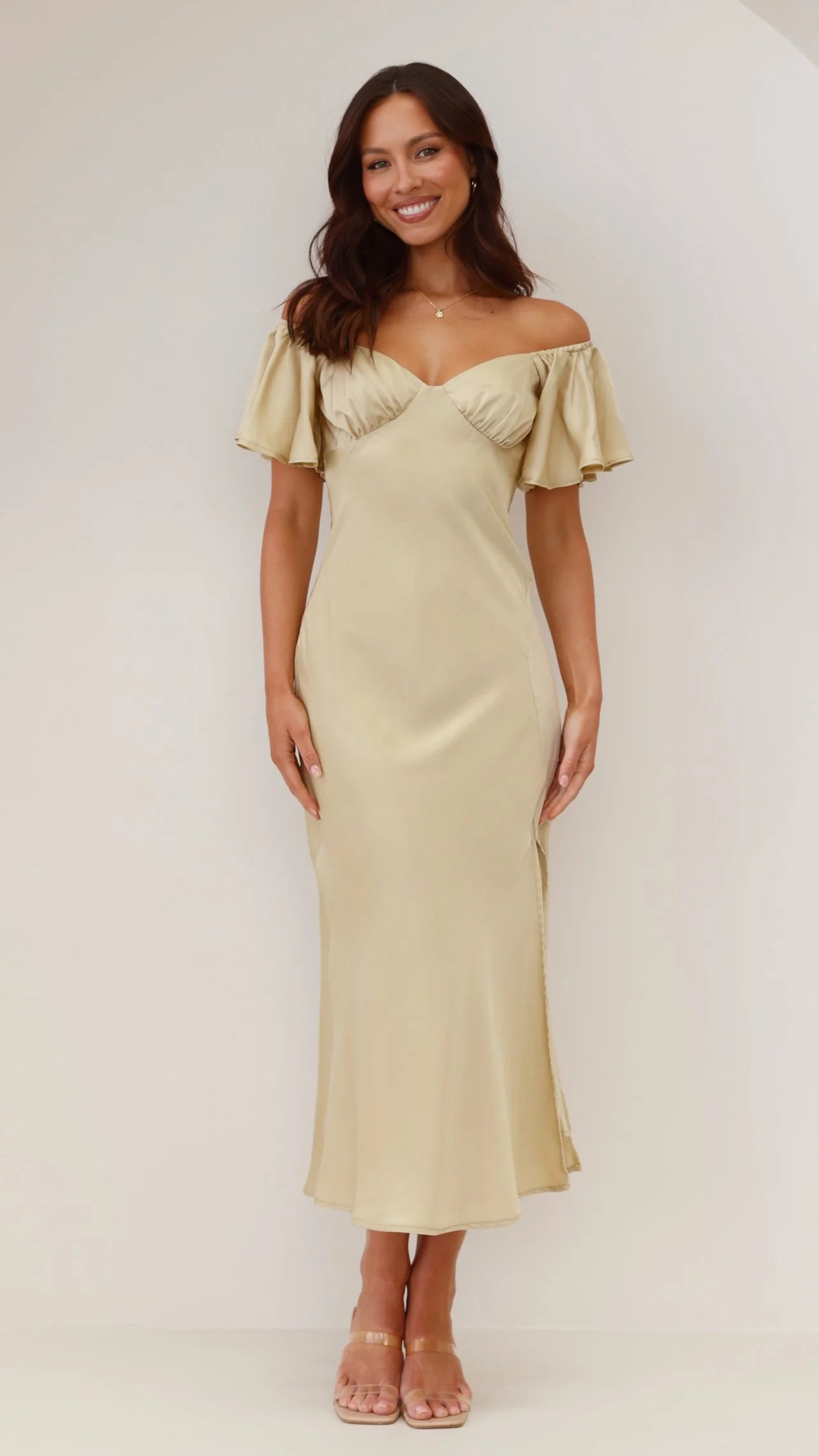 Our Louisa Dress features beautiful butterfly sleeves, flattering off shoulder design, pleated bust and a flirty front slit. This beautiful floaty design takes elegance to the next level - you'll be sure to turn heads in this number. Pair this piece with our Balton Mules - Sugar Brown and Hollow Circle Necklace - Gold