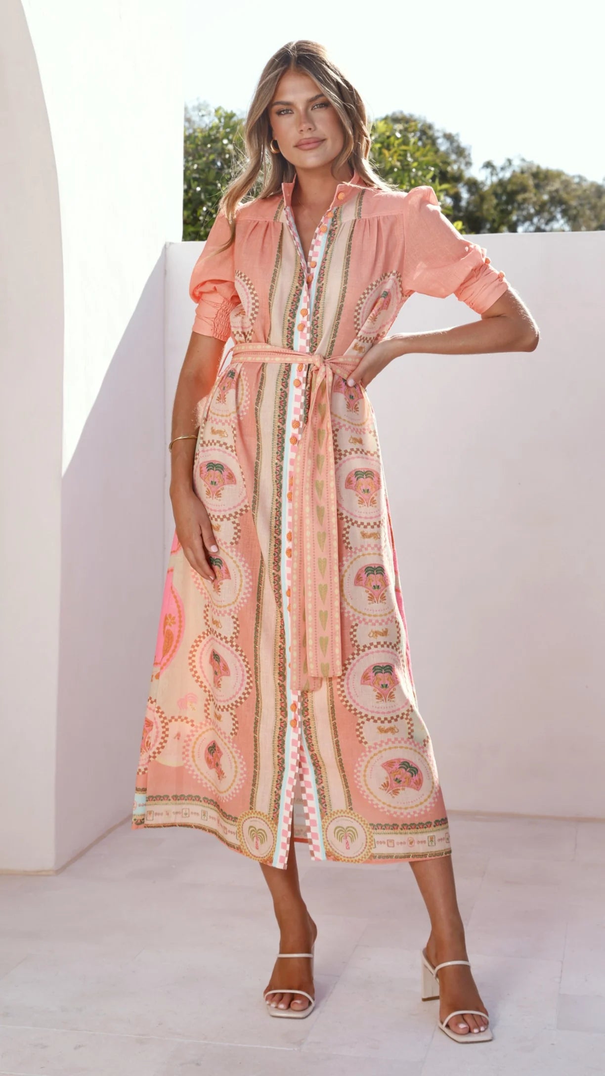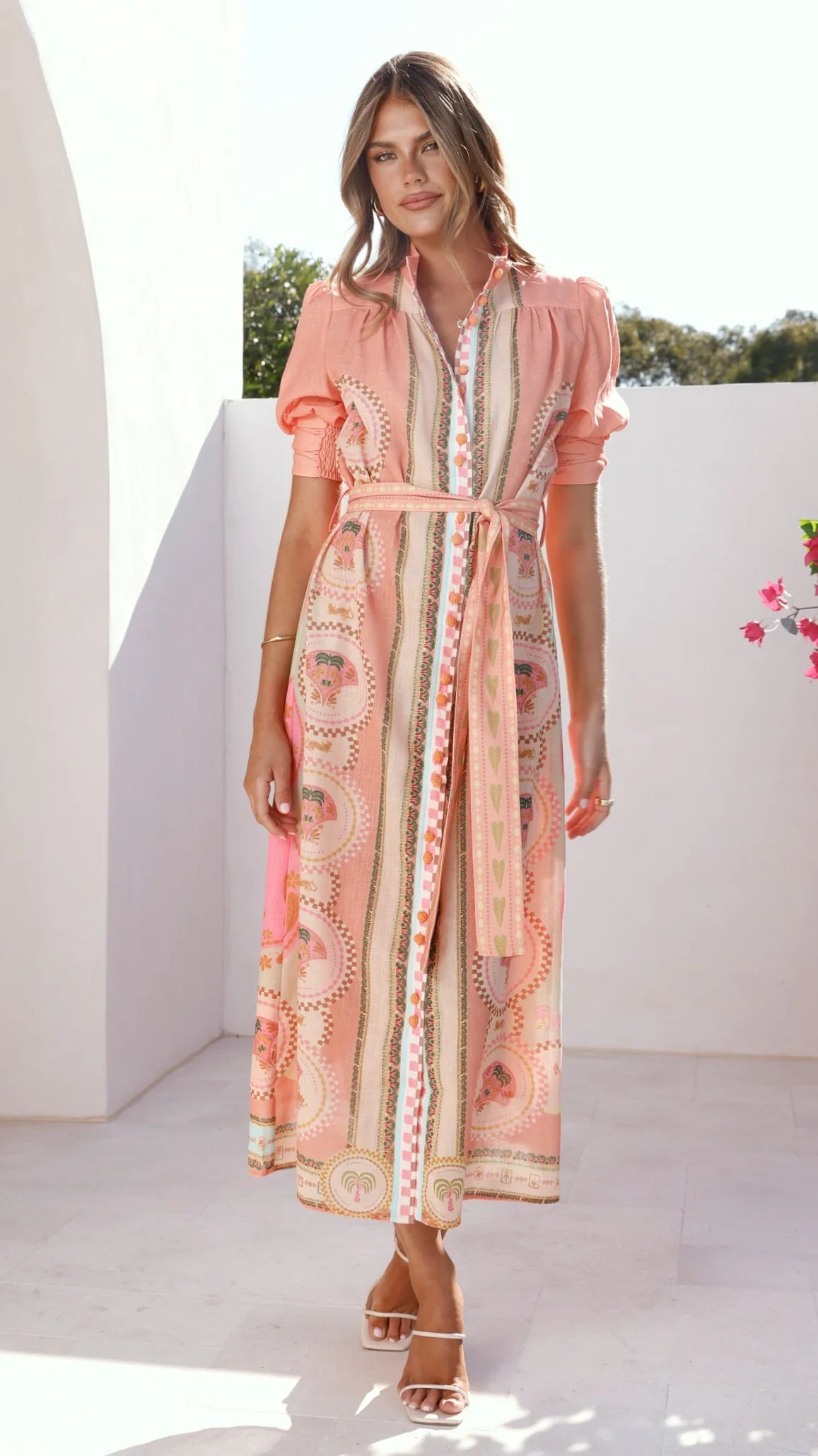 This midi dress features a classic collar and short balloon sleeves with gathered cuffs accented by buttons. It includes fabric-covered buttons down the front and a detachable waist tie for a tailored silhouette. Partially lined with back lining, it combines elegance with comfortable wearability.
