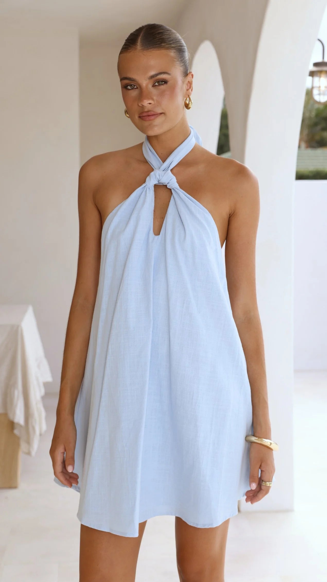The Maja Mini Dress in Blue features a sleek halter tie neck and a relaxed fit for effortless elegance. Its mini length offers a modern silhouette, while the invisible side zip ensures a smooth finish. Fully lined for comfort.