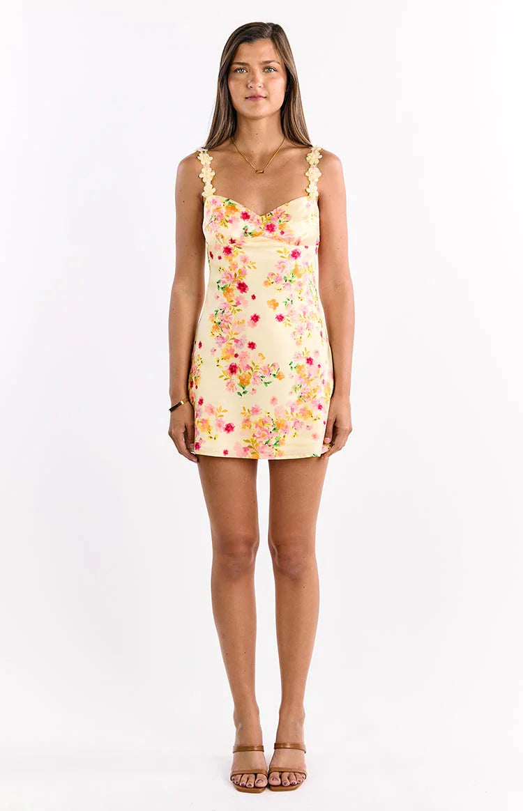 Yellow Floral Strap Satin Mini Dress