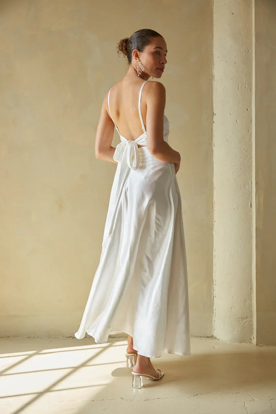 Say "I do" to the romantic Mary Bow Back Satin Maxi Dress. This white satin maxi dress features a v-neckline, open back, and bow detailing that makes this style irresistible. Style with some chic to add the finishing touch!