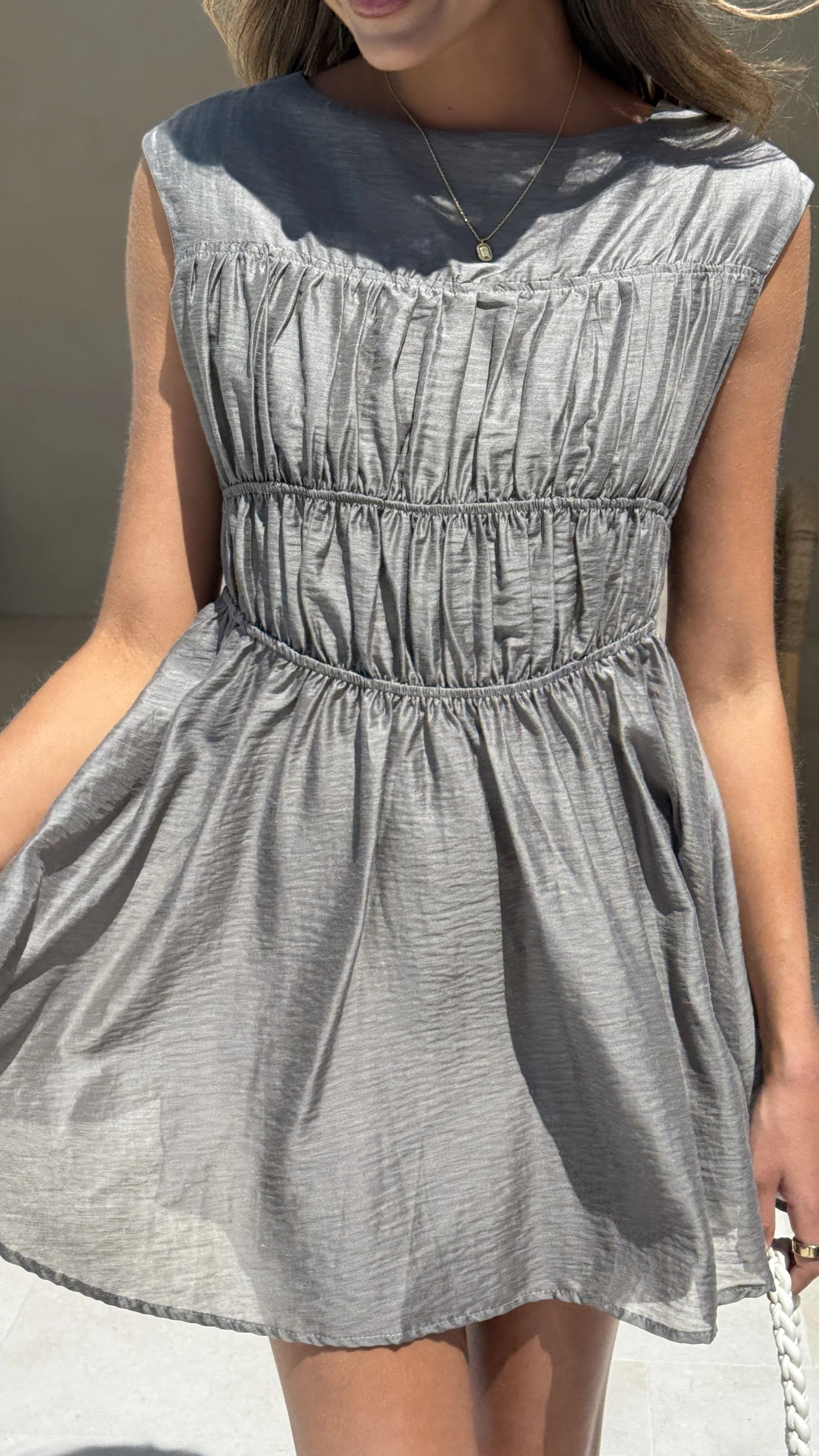 The Masha Mini Dress in Khaki combines refined simplicity with modern design. It features a classic crew neckline and sleeveless cut, complemented by a tiered silhouette that adds depth and movement. The elasticated waist ensures a tailored yet comfortable fit, making it an elegant choice for both day and evening occasions.