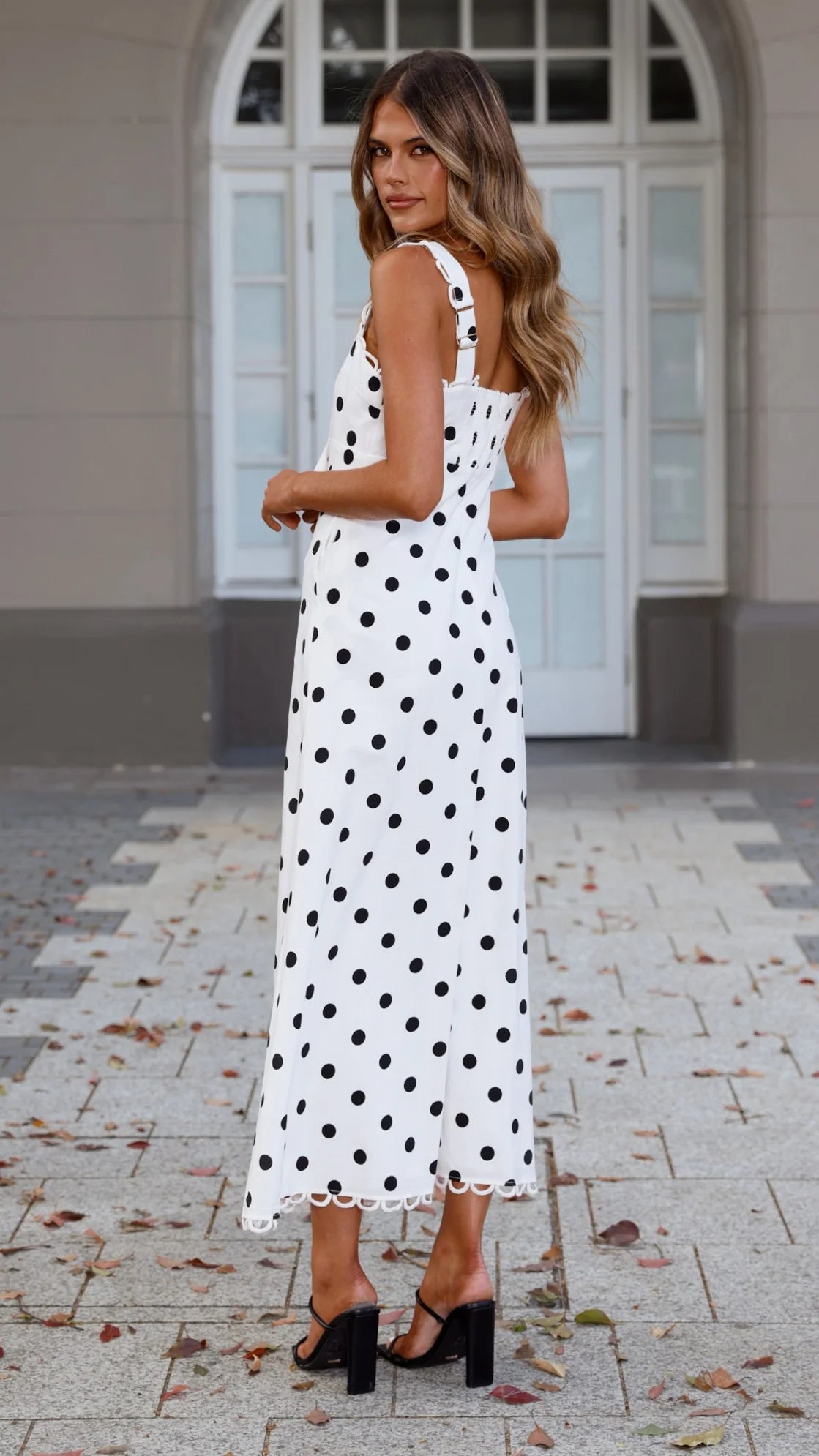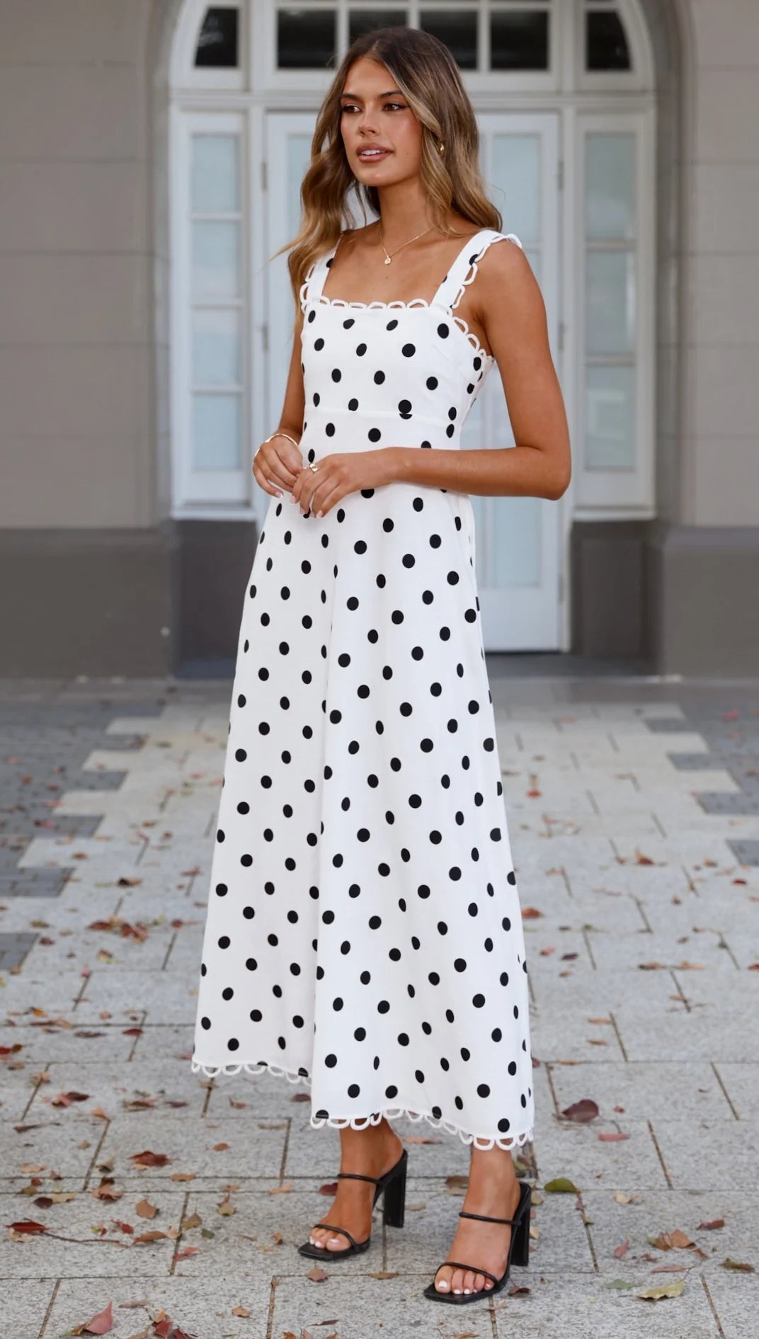 The Milani Maxi Dress in White Polka offers timeless sophistication with its maxi length and elegant square neckline. Adjustable straps provide a customized fit, while delicate scalloped lace detailing on the edges adds a subtle feminine touch. The shirred back panel enhances comfort and shape, complemented by an invisible back zip for a clean, polished look. This dress is perfect for stylish occasions where refined charm is essential.