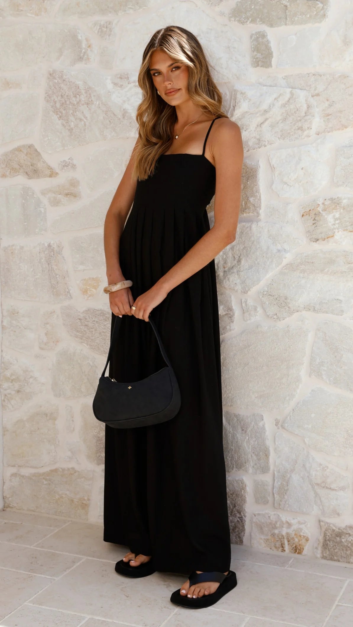 The Pippy Maxi Dress in Black blends timeless style with ultimate comfort. Its maxi length creates a graceful silhouette, while the pleated bust detail adds elegant texture. Designed with a shirred back, it offers flexible comfort that moves with you. Thin adjustable straps ensure a perfect fit, and the bust lining provides additional coverage. This dress is your go-to choice for effortless sophistication on any occasion.