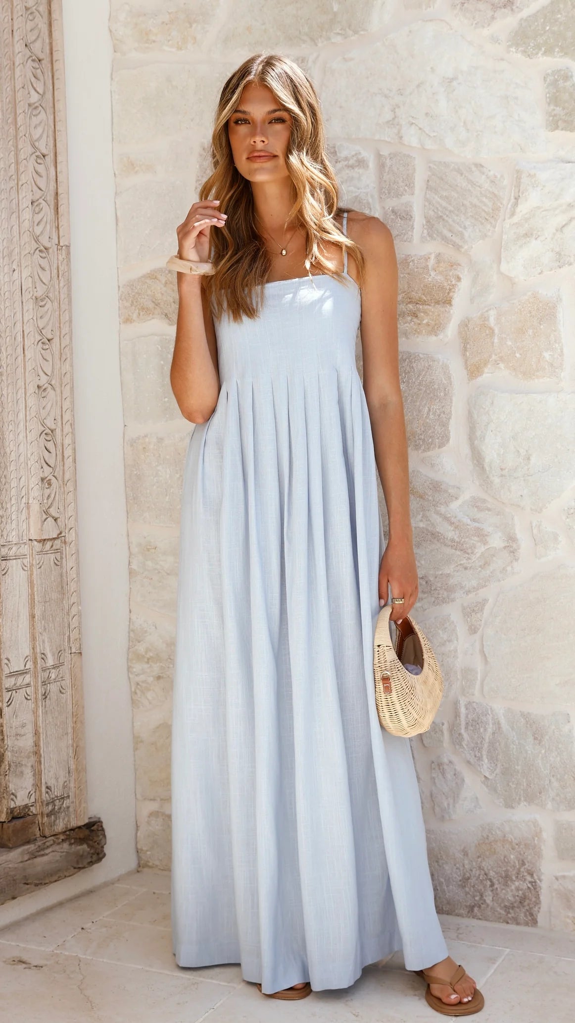The Pippy Maxi Dress in Blue blends timeless style with ultimate comfort. Its maxi length creates a graceful silhouette, while the pleated bust detail adds elegant texture. Designed with a shirred back, it offers flexible comfort that moves with you. Thin adjustable straps ensure a perfect fit, and the bust lining provides additional coverage. This dress is your go-to choice for effortless sophistication on any occasion.