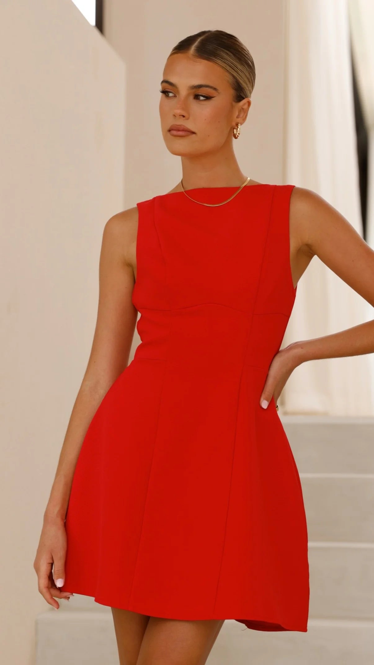 This red mini dress showcases a sleeveless silhouette with a refined high neckline and an elegant scooped back. It features a tailored waist for a flattering shape, an invisible zipper at the back, and is fully lined for a polished finish.