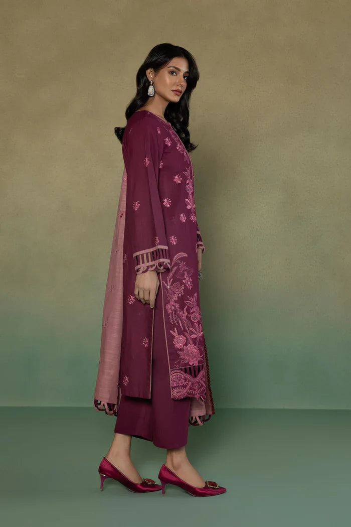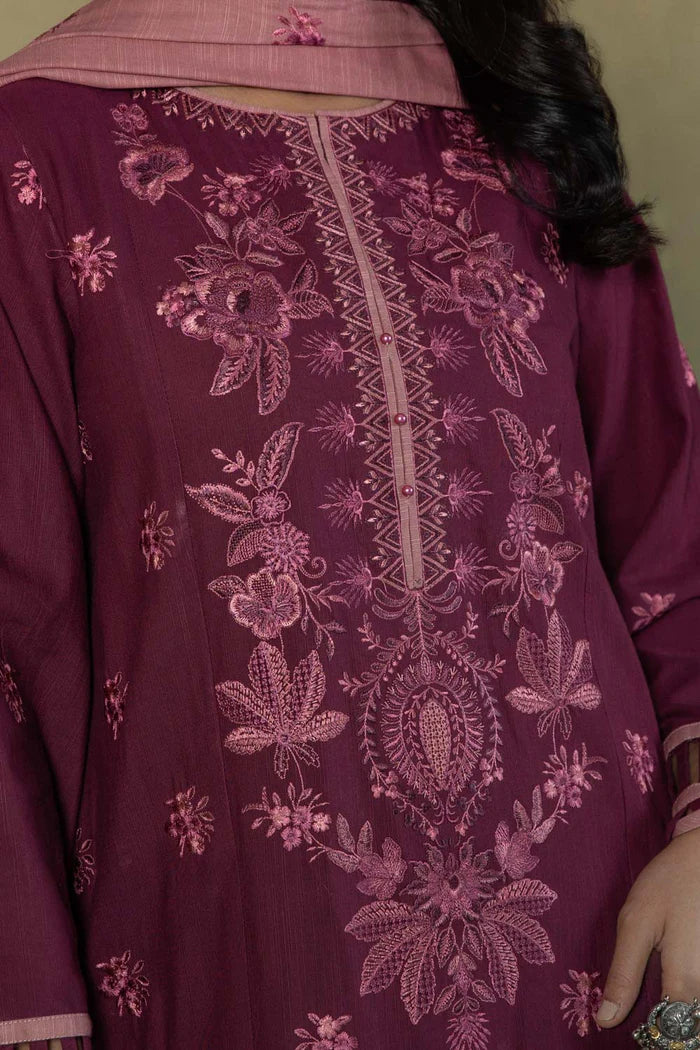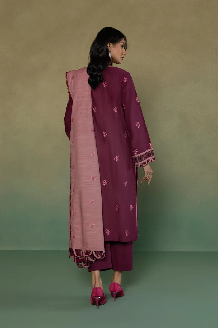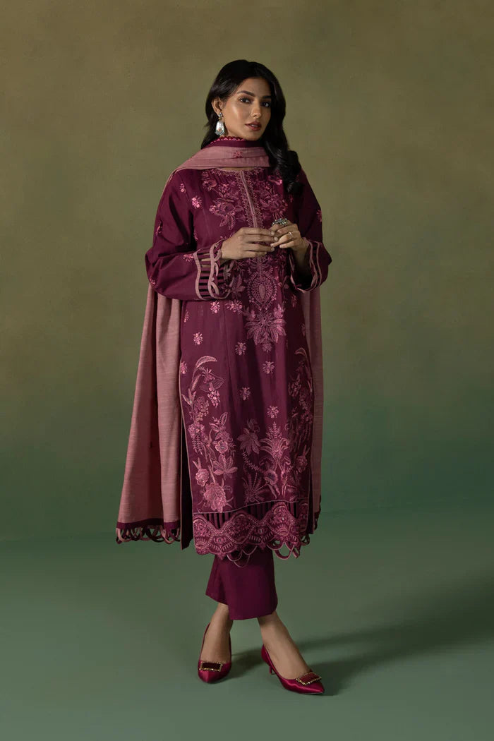 Channel grace with this purple toned three-piece khaddar ensemble featuring intricate embroidery.