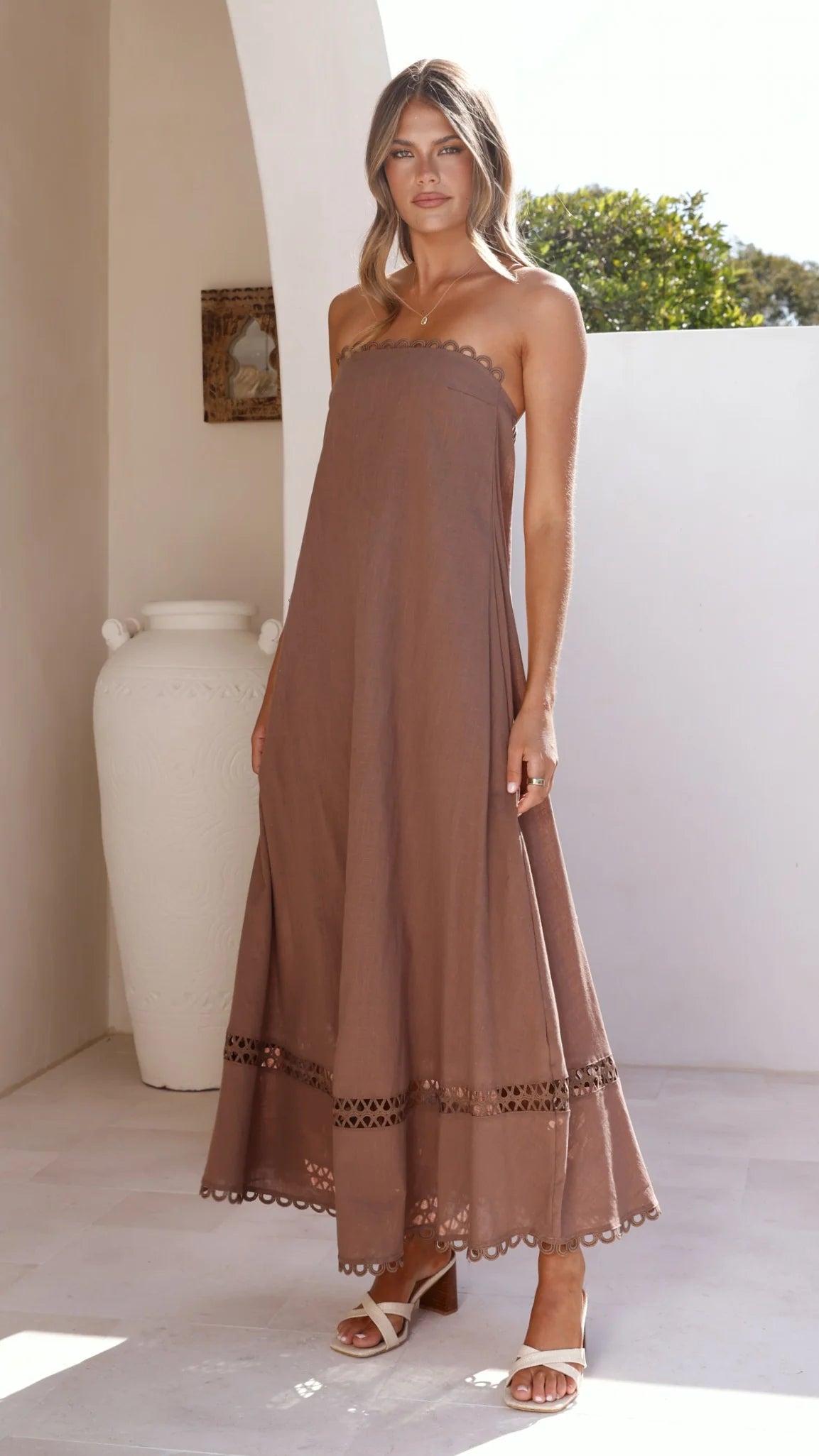 The Sandra Maxi Dress features a strapless design with a silicone grip along the bustline to ensure a secure and comfortable fit. It includes an elasticated backband and an invisible side zip for a sleek appearance, complemented by scalloped lace trim and lace panels that add refined detail. The dress is fully lined to provide a smooth finish.